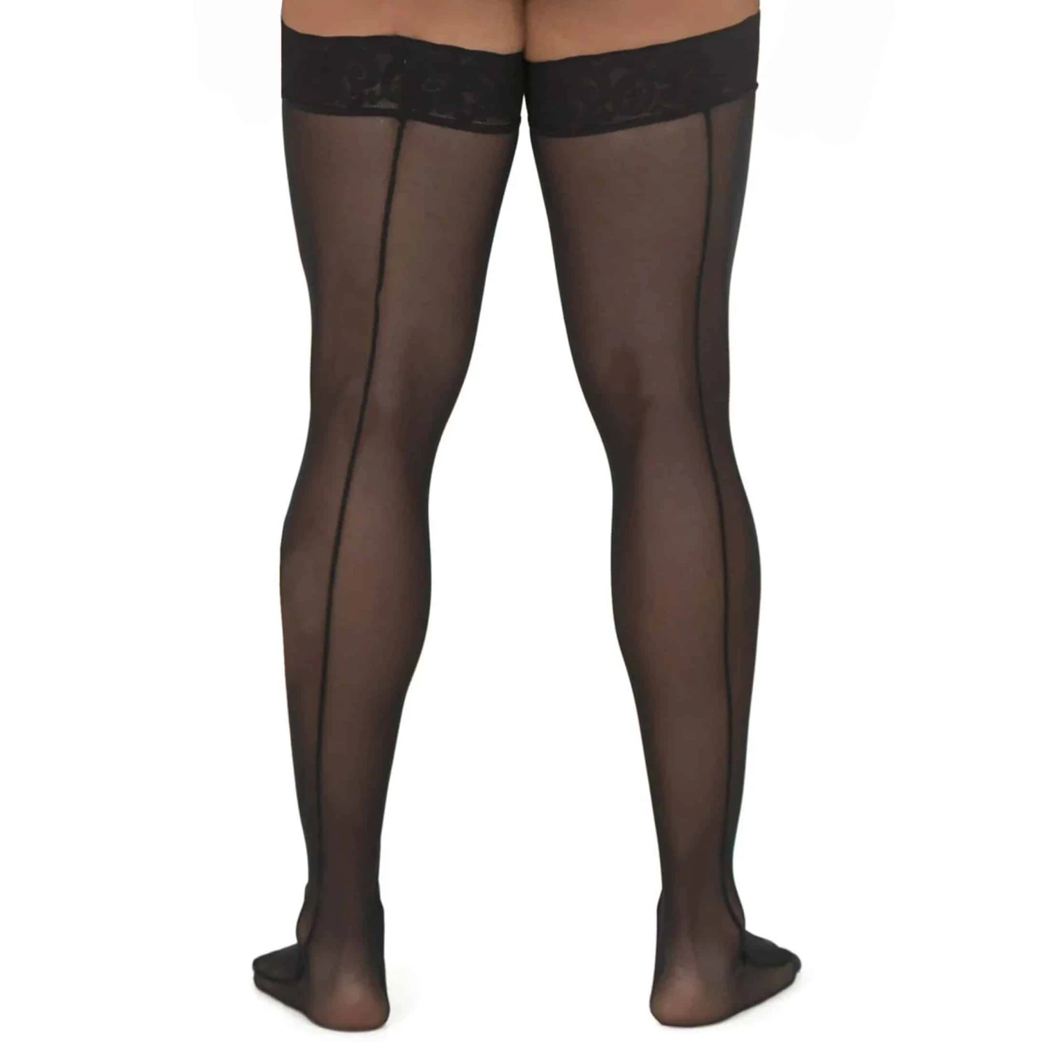 Paire de bas en résille transparente. Dentelle sur la partie supérieure. Bande antidérapante en silicone pour maintenir les collants en haut des cuisses. Taille unique.
