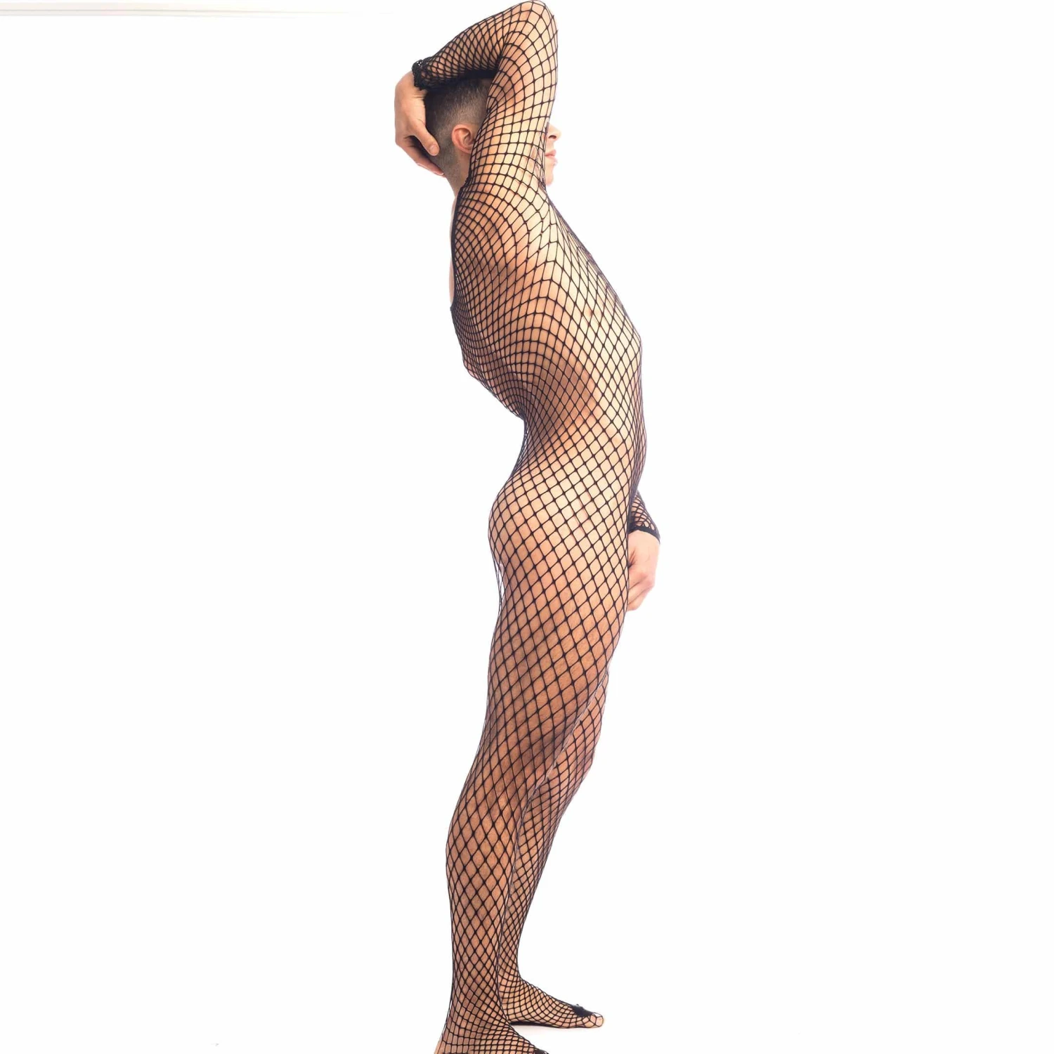 Body moulant intégral en maille large trÚs extensible. Ouvertures devant et derriÚre pour un accÚs immédiat à vos parties les plus intimes. Finitions sans coutures. Jockstrap vendu séparément.