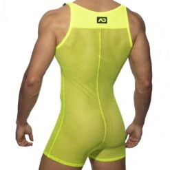 Body sport facon justaucorps de lutteur en mesh sexy et totalement transparent. Col plongeant pour mettre en avant votre musculature. Poche frontale non doublée. Clips fonctionnels sur les épaules. Logo AD en silicone sur le haut du dos.