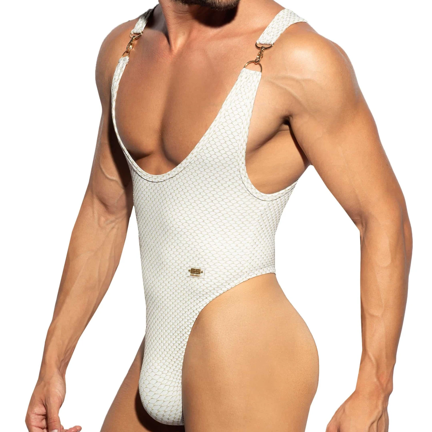 Body string trÚs luxueux en microfibre brodée de fils métallisés Lurex pour un effet cotte de maille. Un maillot de bain original pour les plus audacieux. Mousquetons dorés sur les bretelles. Poche frontale moulée sans couture pour un confort optimal. Logo ES Collection en silicone.