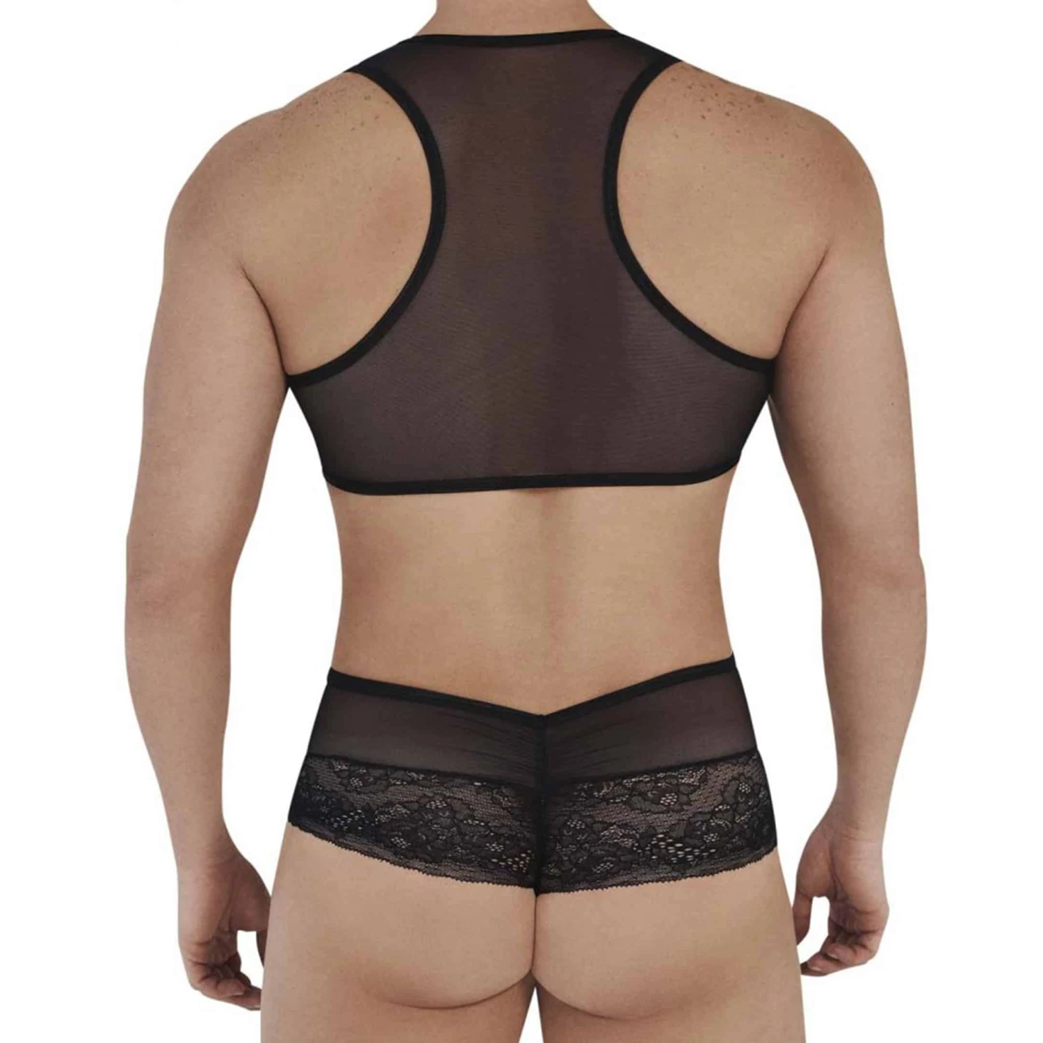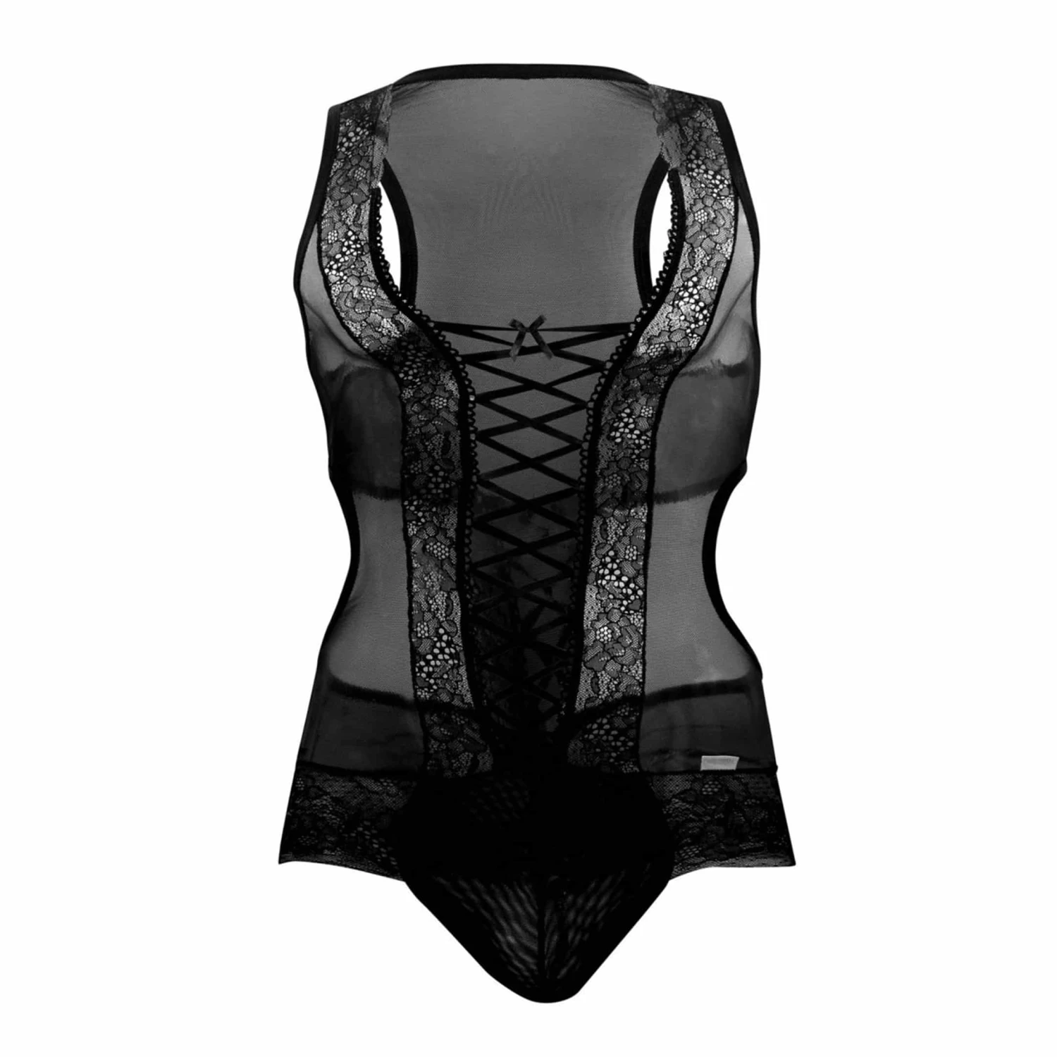 Body string trÚs sexy et provocant en maille transparente et dentelle florale. Laçage croisé devant. Design ouvert sur les cÎtés et dans le dos.