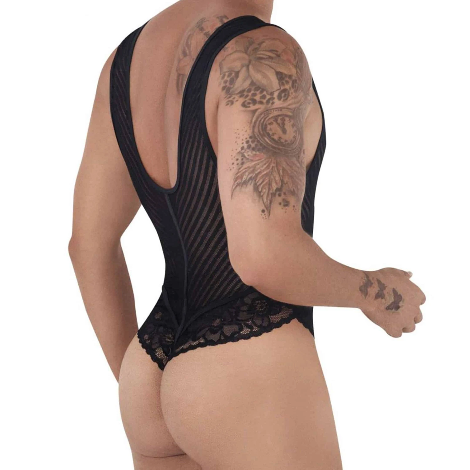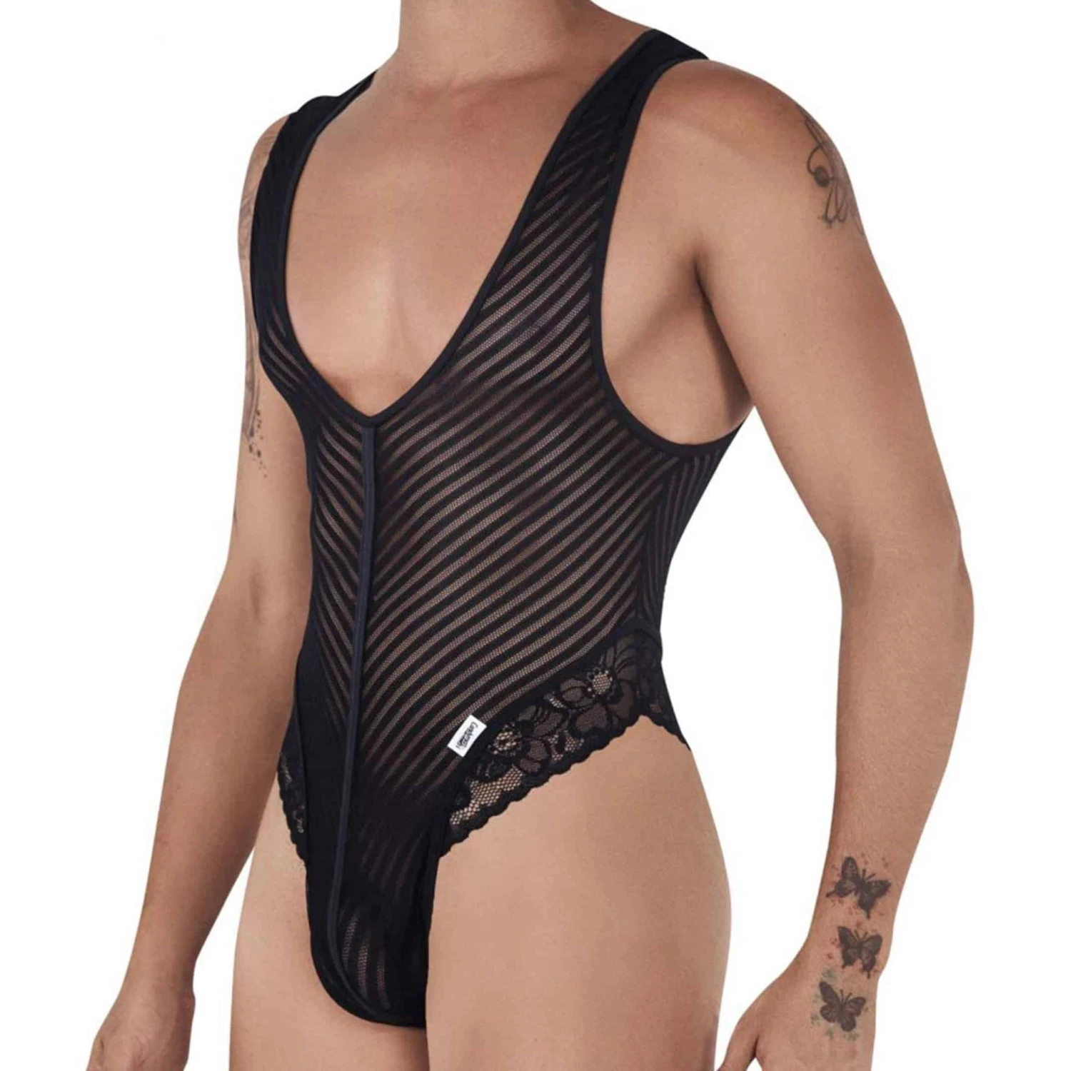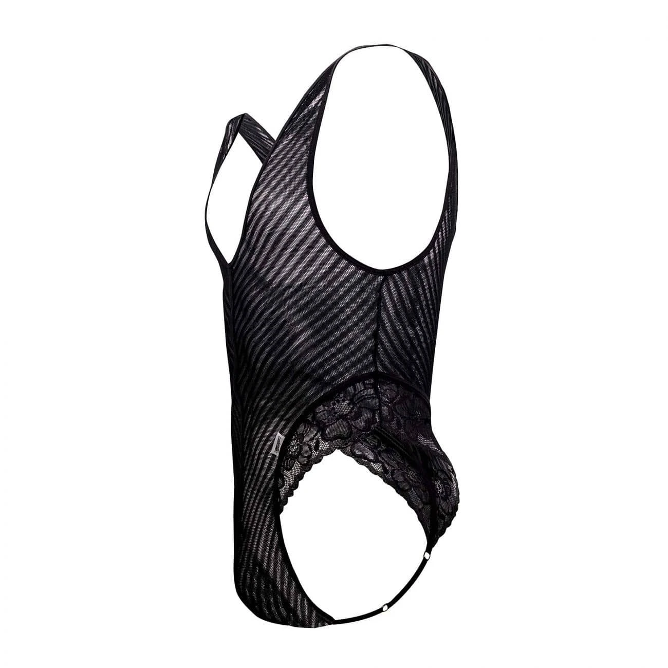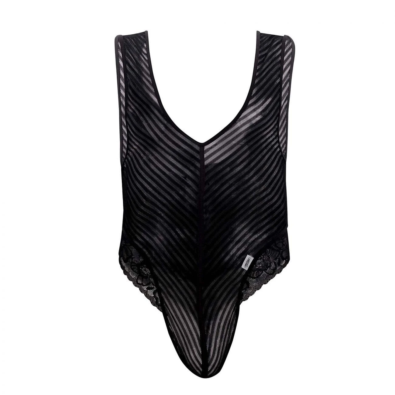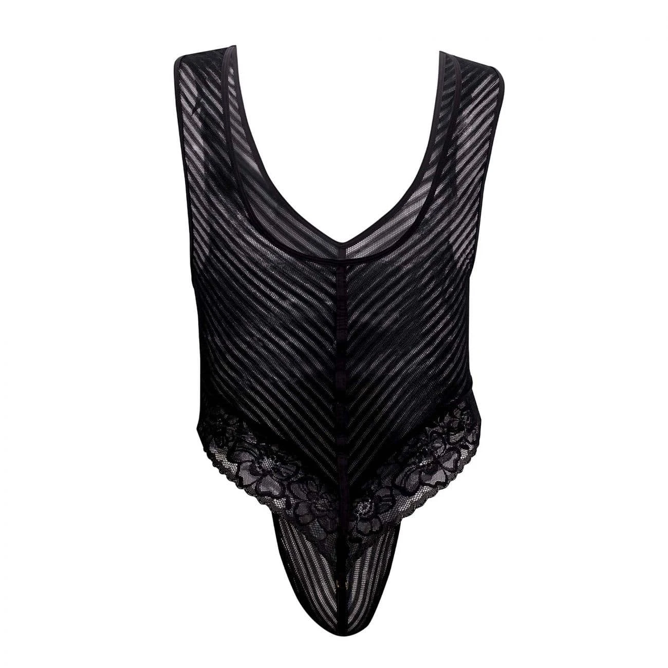 Body string trĂšs sexy en rĂ©sille rayĂ©e semi-transparente. DĂ©tails en dentelle florale. Coupe trĂšs ajustĂ©e et Ă©chancrĂ©e sur les cĂŽtĂ©s. Col en V plongeant. Ficelle ajustable Ă l’entrejambe.