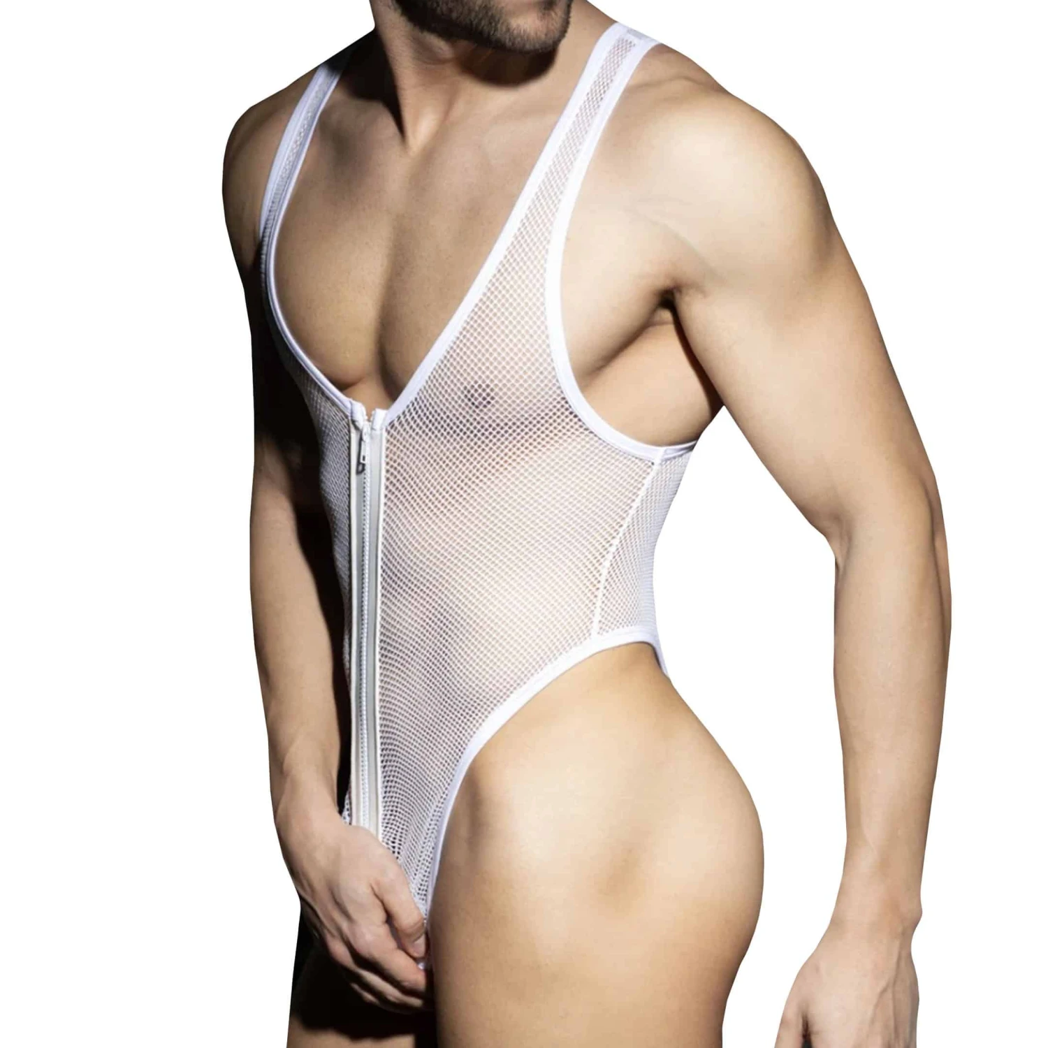 Body string en mesh dont le maillage large ne laisse que peu de place Ă l’imagination. Fermeture Eclair fonctionnelle pour un accĂšs direct Ă vos parties. Coupe trĂšs ajustĂ©e avec col plongeant pour mettre en avant votre musculature. Poche frontale transparente non doublĂ©e. Logo AD en silicone dans le dos.