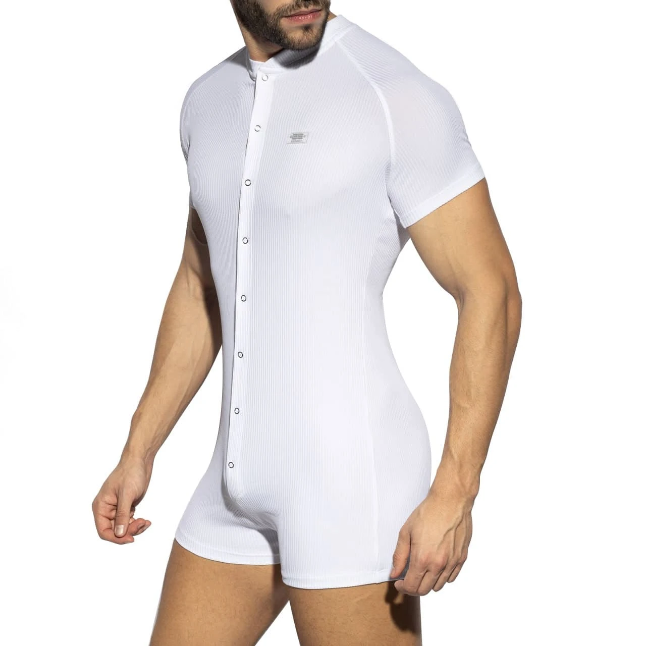 Body trÚs doux et confortable en microfibre extensible cÎtelée et recyclée. Fermeture par boutons pression et fermeture Eclair sur la partie inférieure. Col rond et manches courtes. Logo ES en silicone cousu sur la poitrine.