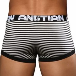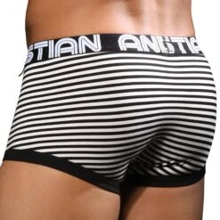 Boxer taille basse en coton doux et confortable. Elégante rayure nautique. Ouverture façon kangourou. Poche Almost Naked, qui épouse et soutient les organes génitaux, sans les comprimer. Ceinture élastique amincissante signée Andrew Christian. Edition limitée.