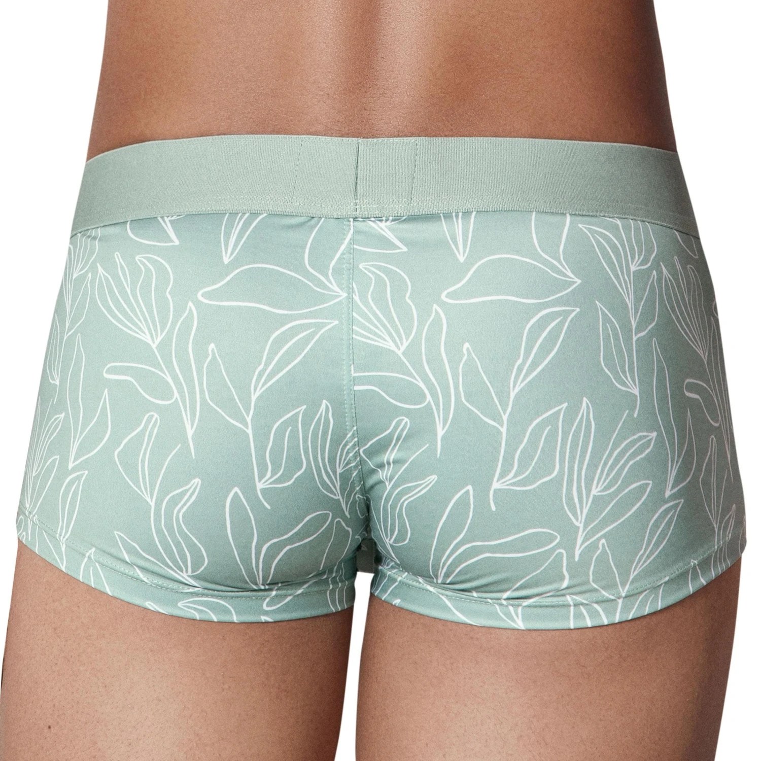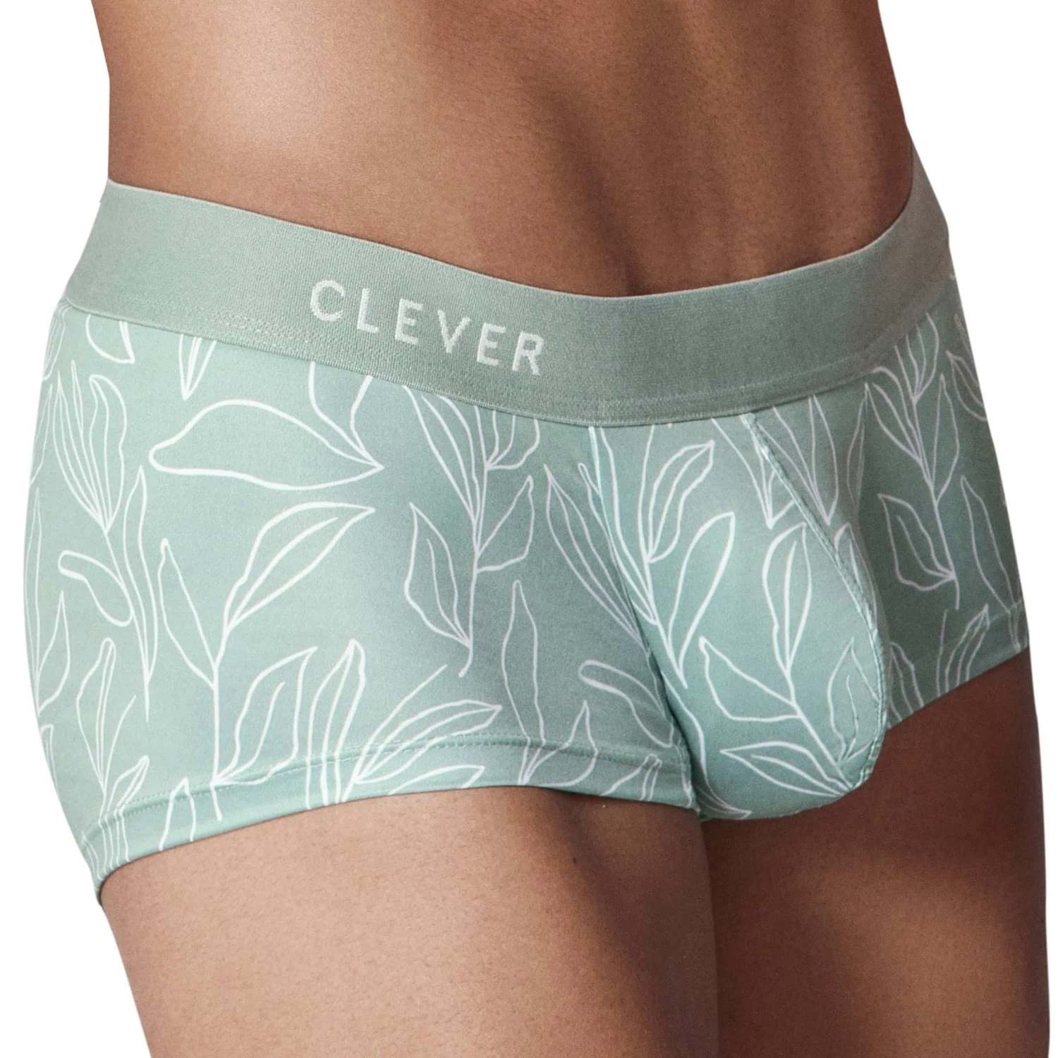 Boxer doux et confortable en microfibre extensible légÚre. Imprimé feuilles trÚs élégant. Poche frontale ergonomique non doublée. Ceinture élastique signée Clever.