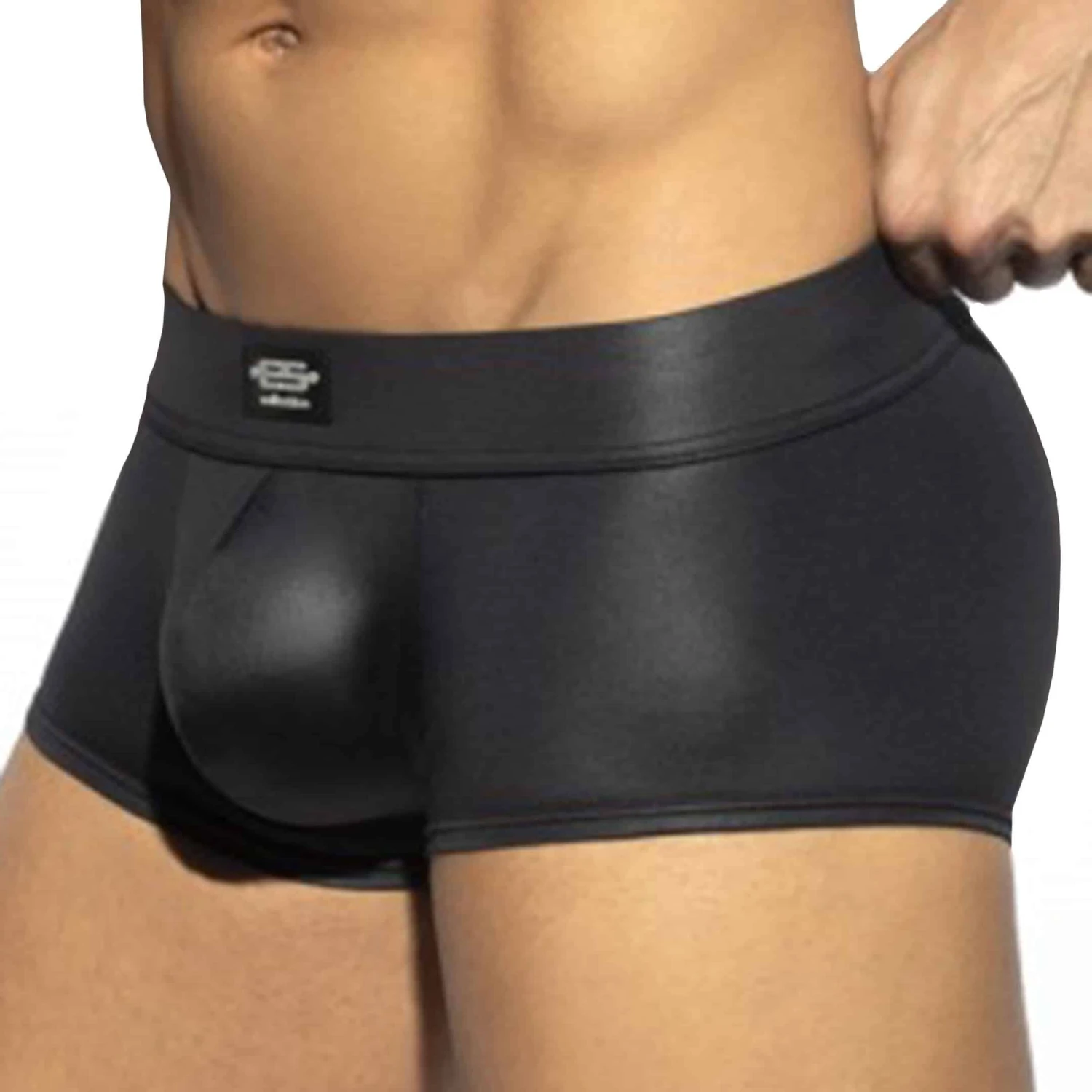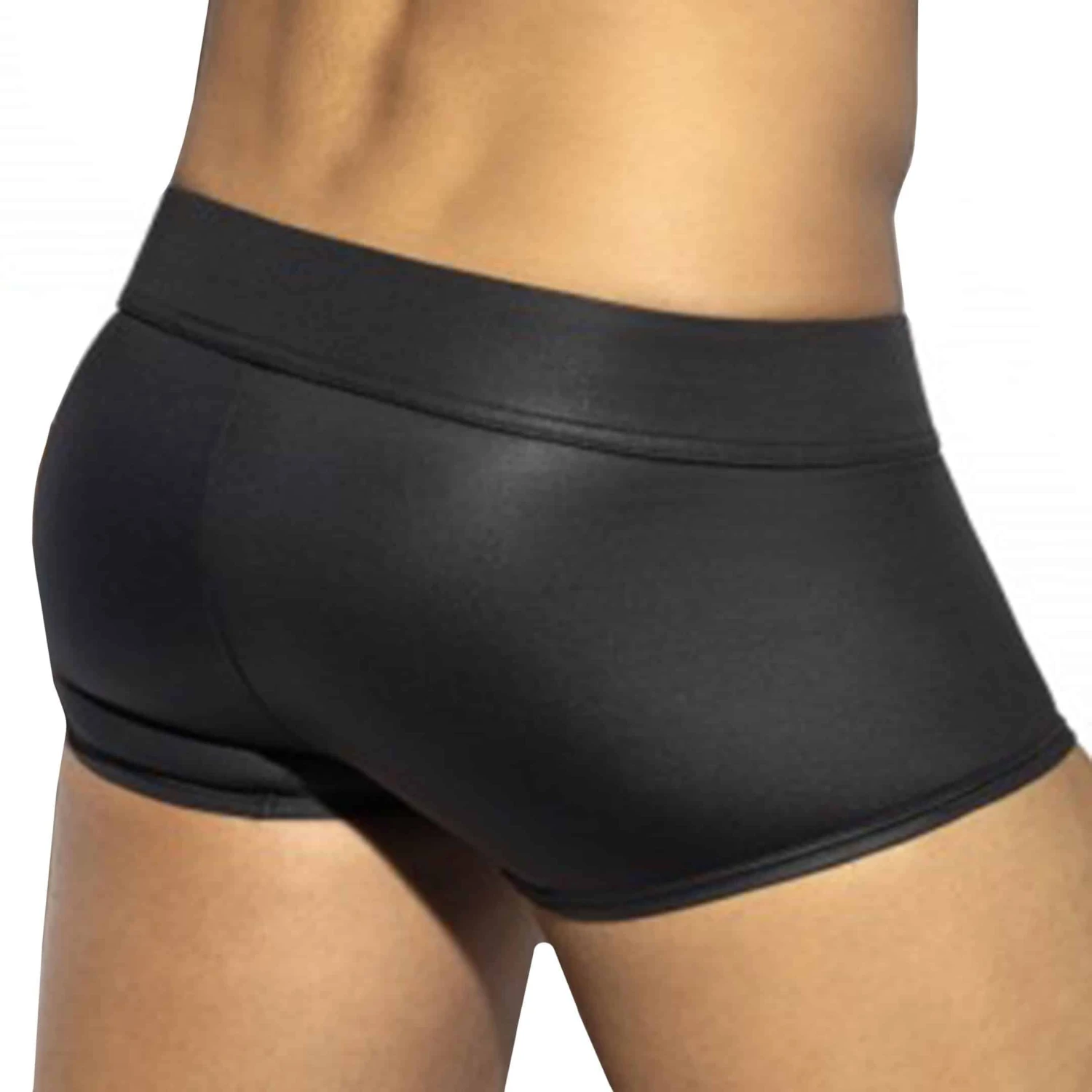 Boxer en microfibre écologique provenant du recyclage de bouteilles plastique trouvées en mer Méditerranée. Aspect cuir pour un look trÚs fetish. Coupe taille basse ajustée. Ceinture élastique signée ES Collection.