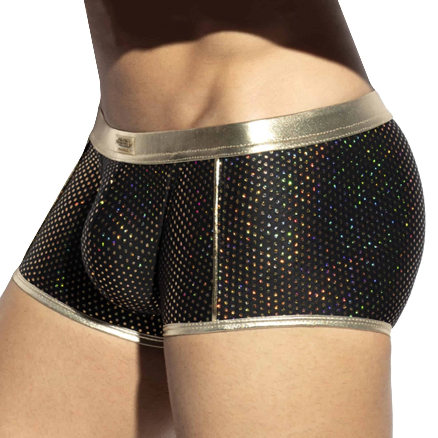 Boxer trĂšs sexy en microfibre extensible recouvert de pois brillants. DĂ©tails d’aspect mĂ©tallique. Grande poche frontale. Ceinture Ă©lastique avec logo ES Collection en silicone.