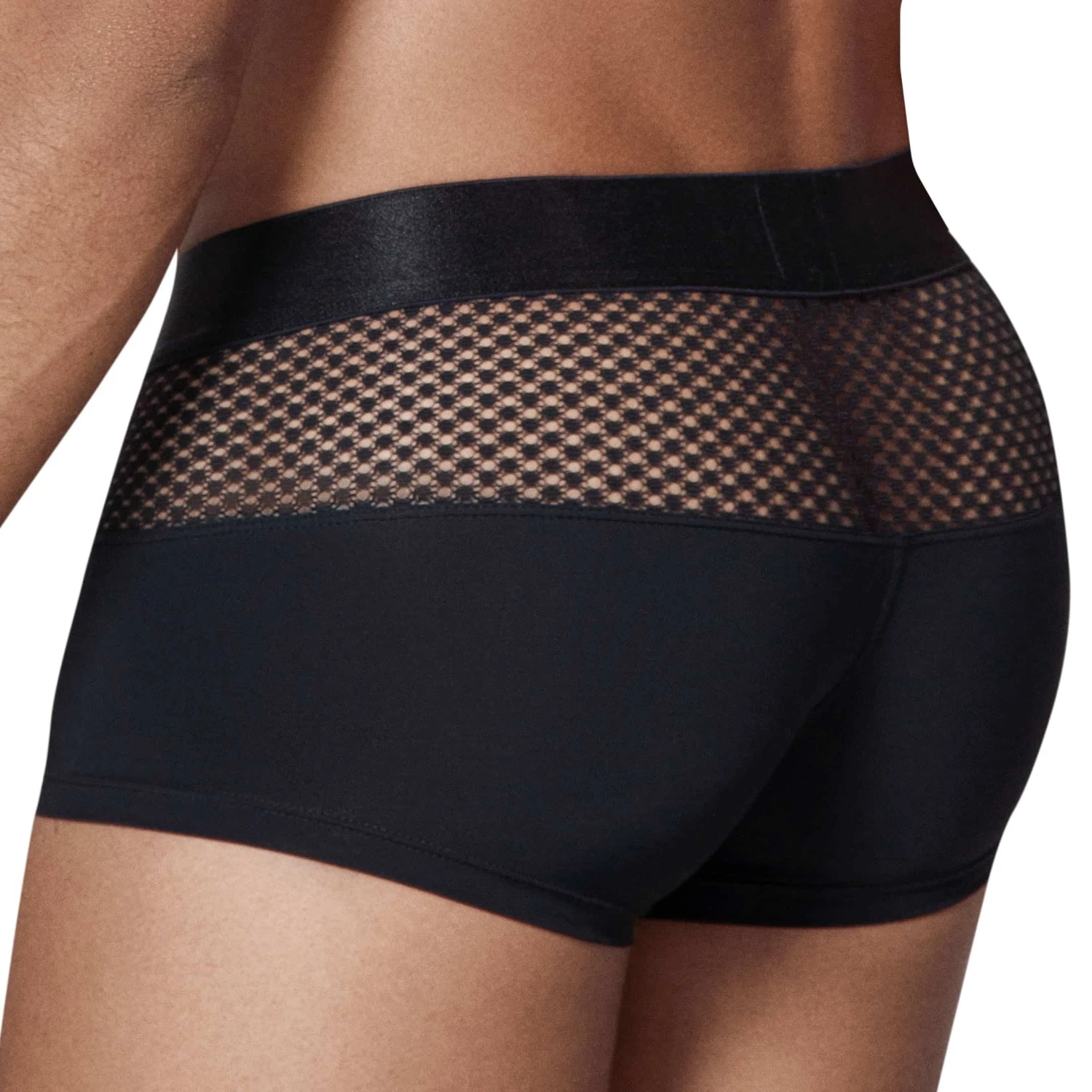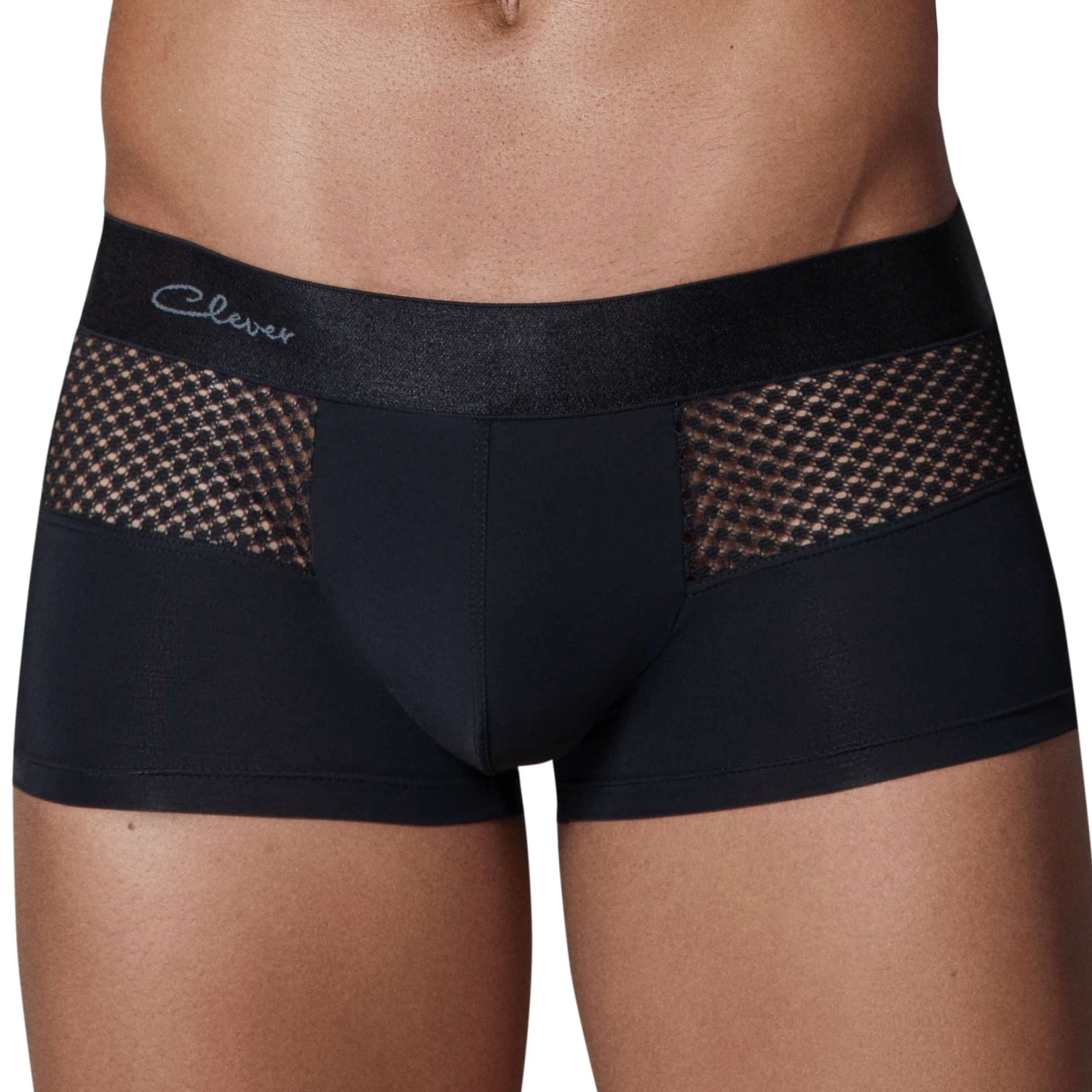 Boxer sexy en microfibre extensible, douce et confortable. EmpiÚcements en résille transparente sur les cÎtés et en haut des fesses. Poche frontale ergonomique non doublée. Ceinture élastique signée Clever.