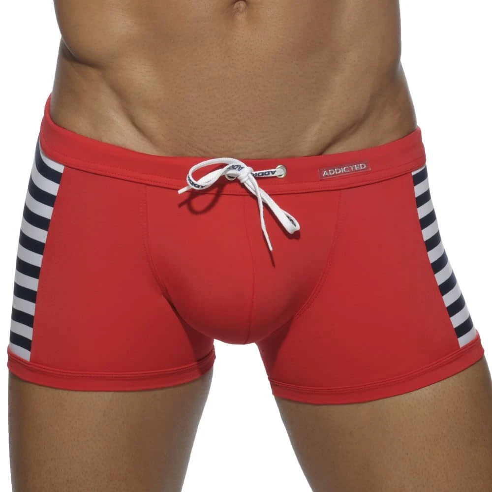 Boxer de bain taille basse, sexy et ajusté. Rayures façon mariniÚre sur les cÎtés. SystÚme Pack Up amovible. Logo Addicted cousu sur la ceinture élastique. Cordon de serrage de couleur contrastée.