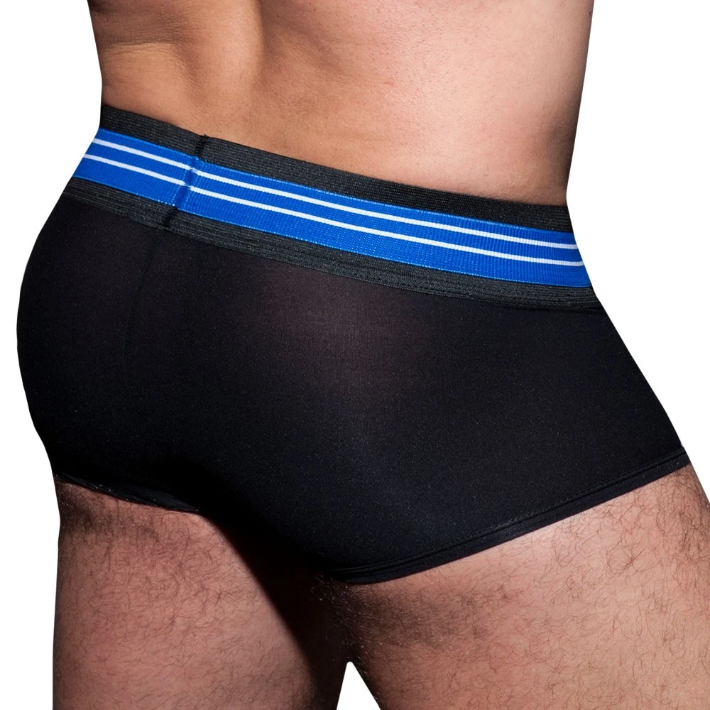 Boxer taille basse en microfibre fine et lĂ©gĂšre. Poche frontale en mesh respirant de couleur contrastĂ©e. Ceinture Ă©lastique extra-large dĂ©corĂ©e d’une double d’une bande rayĂ©e et du logo AD Fetish en silicone.