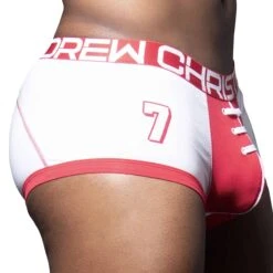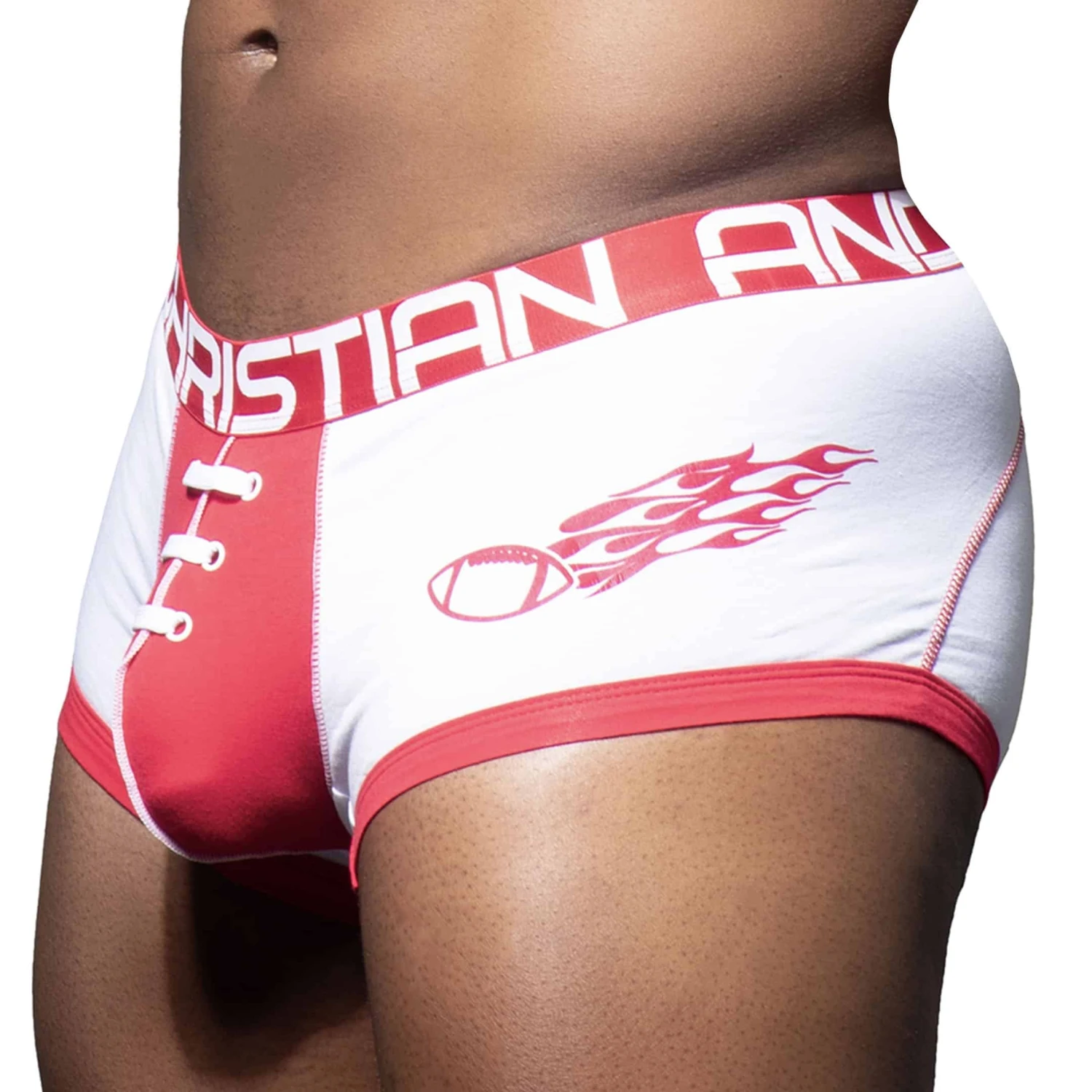 Boxer super doux et confortable en coton extensible. Lacet devant et imprimé sur la cuisse évoquant le football américain. Poche ergonomique qui épouse et soutient les organes génitaux, sans les comprimer, Ceinture élastique amincissante signée Andrew Christian. Edition limitée.