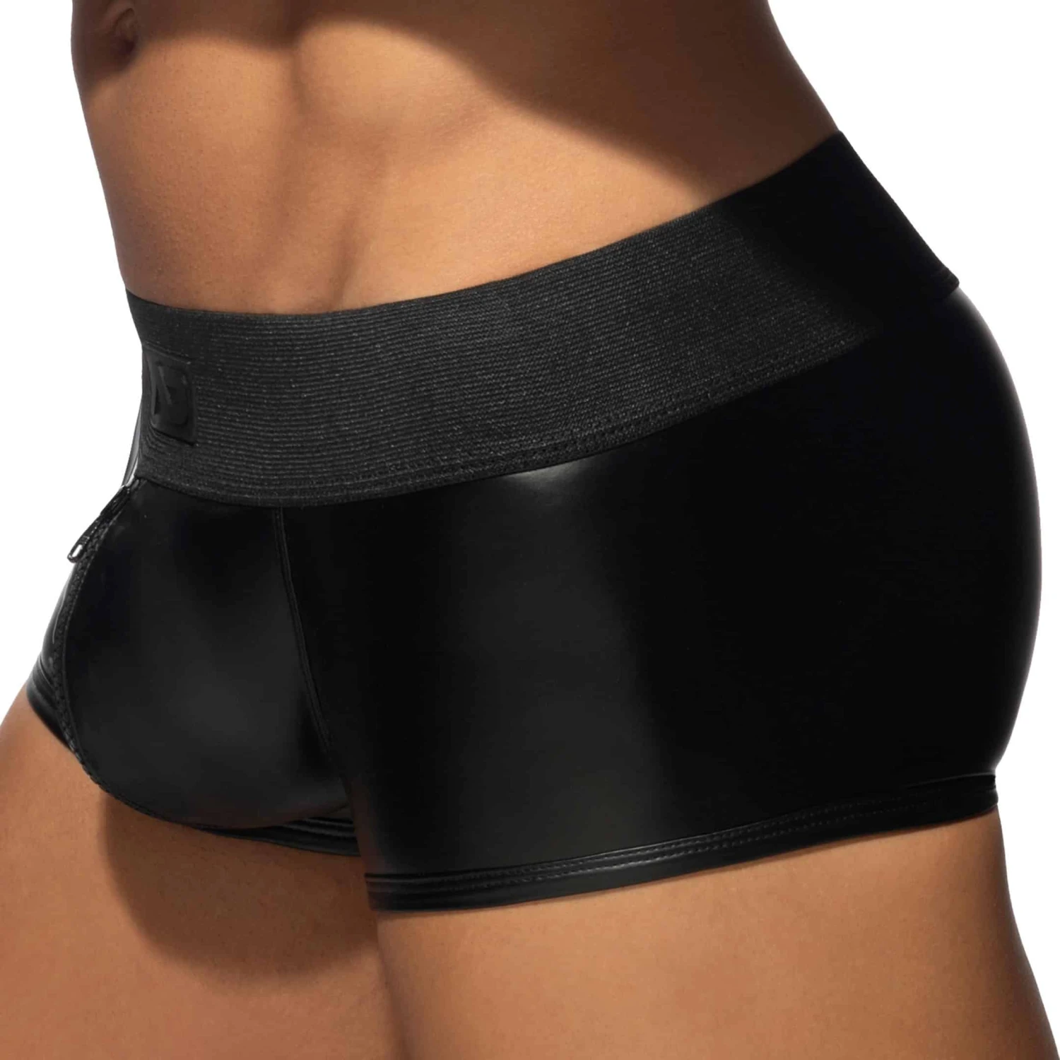 Boxer innovant en microfibre brillante imitant le caoutchouc, pour un look trÚs fetish. Fermetures Eclair fonctionnelles devant et derriÚre. Technologie RingUp intégrant un anneau cock ring en silicone (diamÚtre 5 cm, amovible par bouton pression) pour une érection plus dure et plus longue. Ceinture élastique extra-large signée du logo AD en silicone.