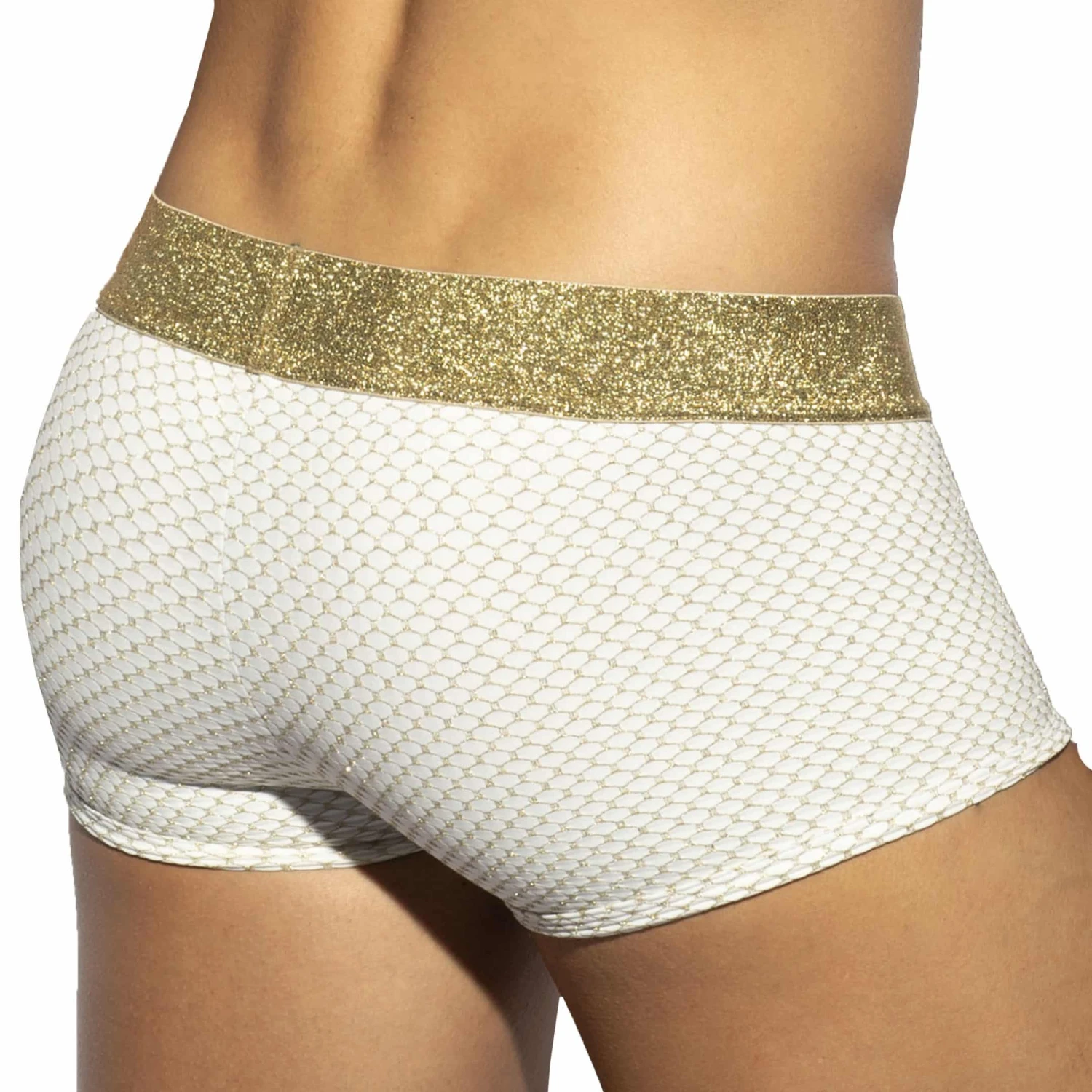 Boxer court trÚs luxueux en microfibre brodée de fils métallisés Lurex pour un effet cotte de maille. Coupe taille basse trÚs ajustée. Ceinture élastique dorée signée du logo ES Collection en silicone.
