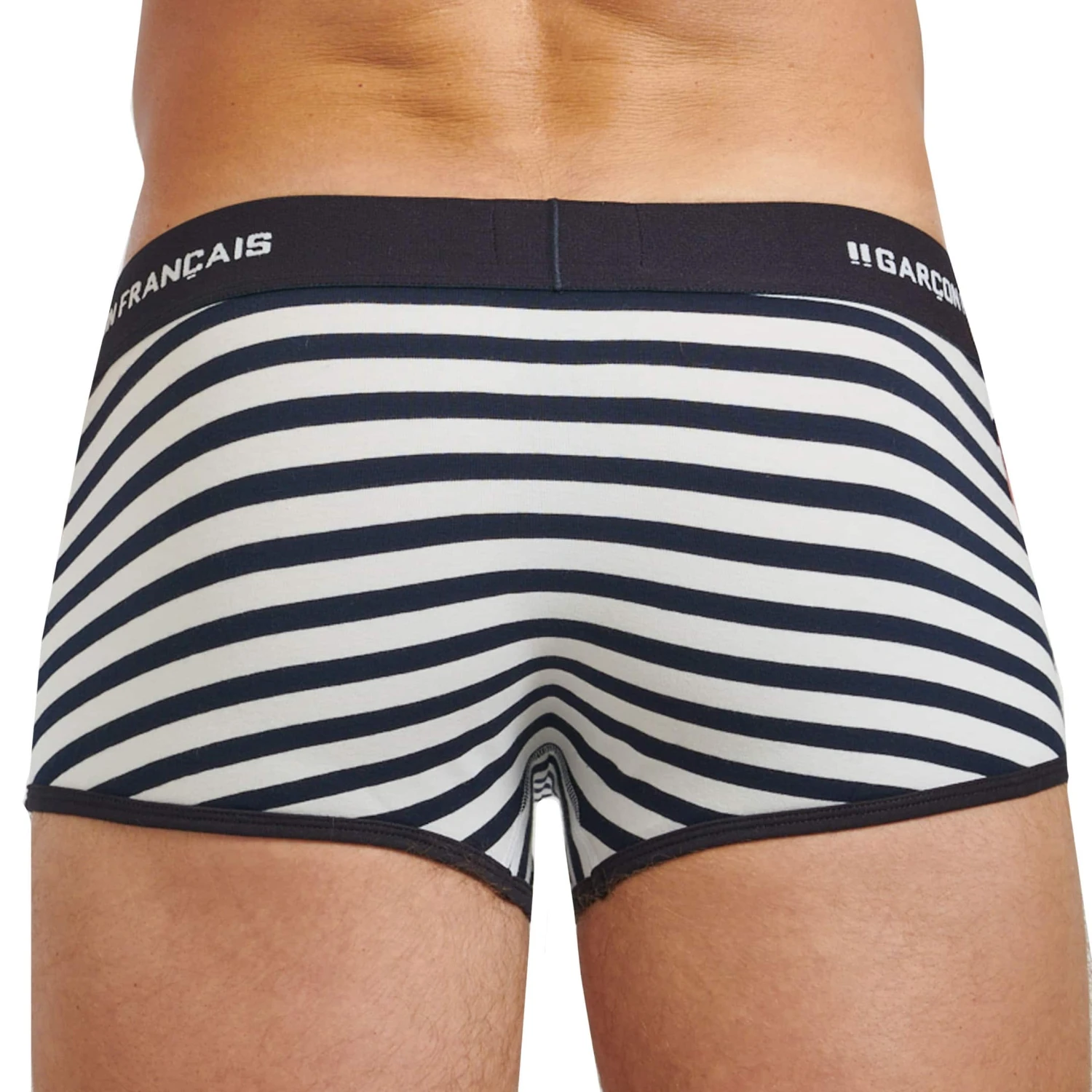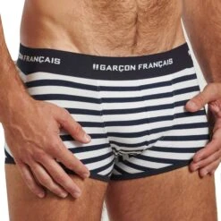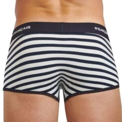 Boxer taille basse trÚs ajusté en coton doux, souple et confortable. Rayures façon mariniÚre avec grande qualité de finition. Poche frontale doublée pour plus de confort. Belle ceinture Garçon Français et bordures de couleur contrastée. Fabrication 100% française.