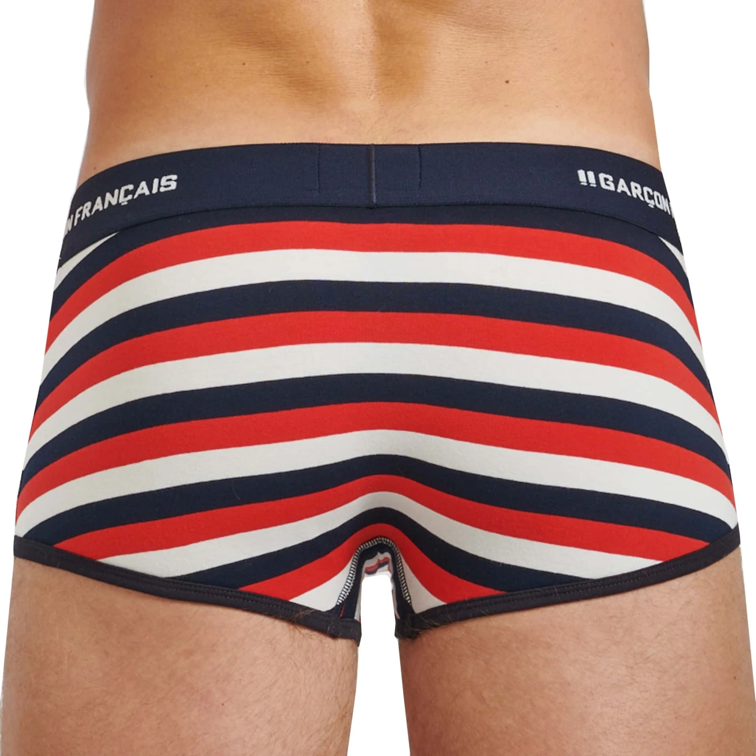 Boxer taille basse trÚs ajusté en coton doux, souple et confortable. Rayures tricolores avec grande qualité de finition. Poche frontale doublée pour plus de confort. Belle ceinture Garçon Français et bordures de couleur contrastée. Fabrication 100% française.