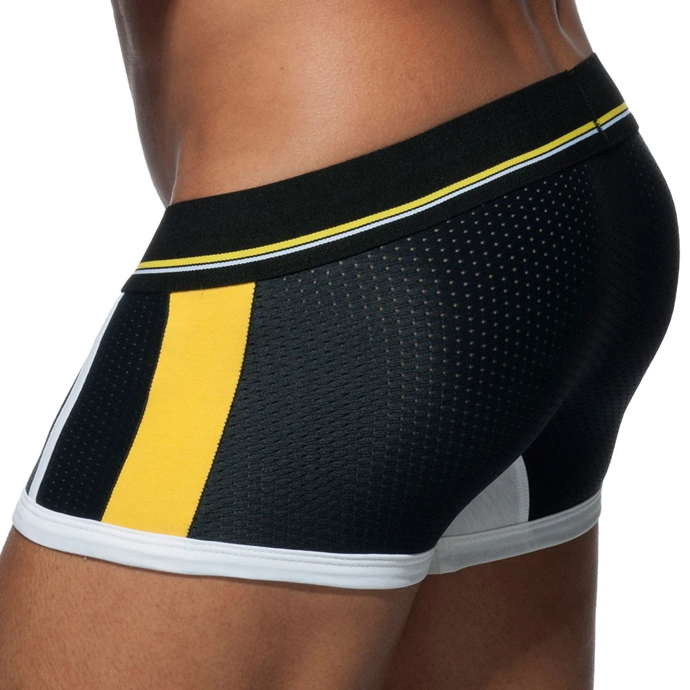 Boxer taille basse trÚs ajusté en mesh respirant, léger et confortable. Bandes sport sur les cÎtés. Bordures de couleur contrastée. Ceinture élastique signée Addicted. Fabriqué à Barcelone.
