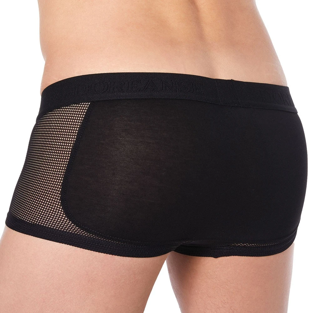 Boxer uni, taille basse et sexy, en mélange ultra doux, fin et confortable de modal et de coton. EmpiÚcements en mesh sport ajouré sur les cÎtés. Poche frontale doublée. Ceinture élastique signée Doreanse.