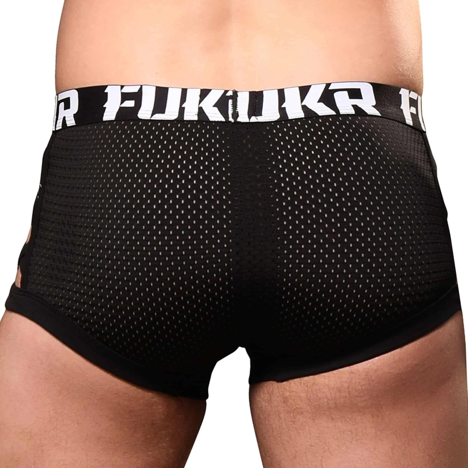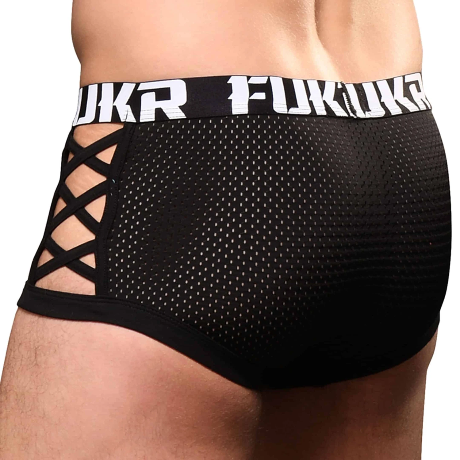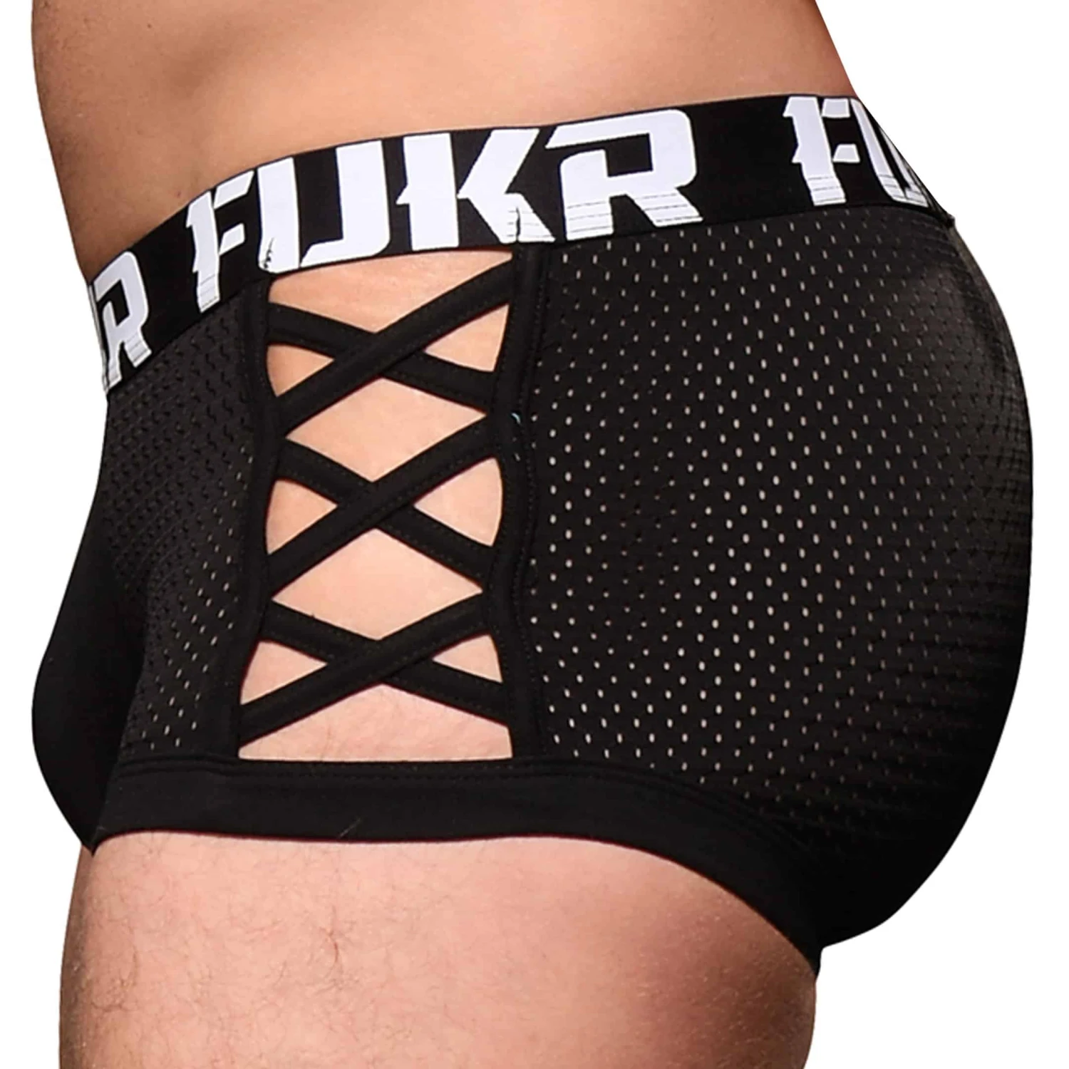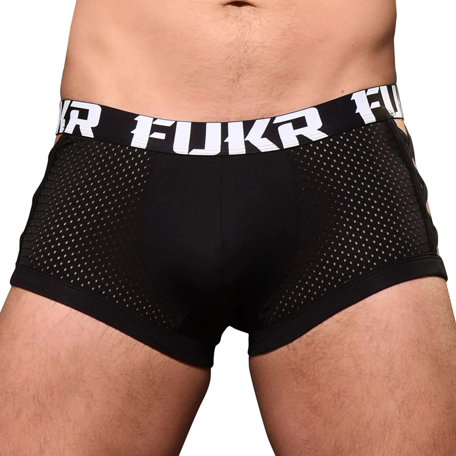 Boxer sexy en résille douce extensible dans 4 directions. Laçage croisé sur les cÎtés. Poche ergonomique qui épouse et soutient les organes génitaux, sans les comprimer. Ceinture élastique signée FUKR. Edition limitée.