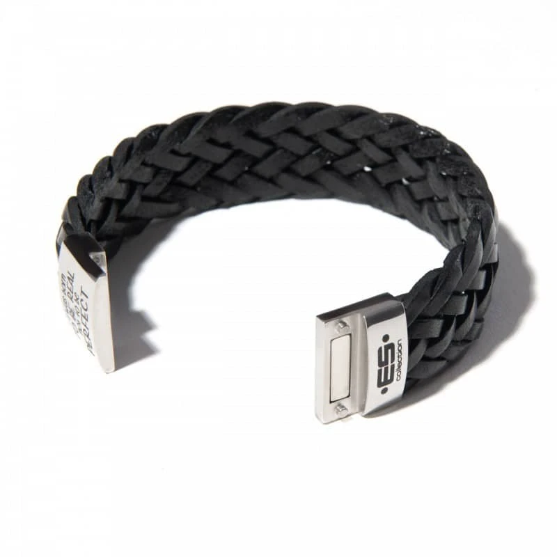Bracelet Ă©lĂ©gant en cuir tressĂ©. Fermoir mĂ©tallique magnĂ©tique. Inscription « I was born to be real not to be perfect » (« Je suis nĂ© pour ĂȘtre rĂ©el, pas pour ĂȘtre parfait »). Pochette signĂ©e ES Collection. Disponible en deux tailles : S/M 18 cm et L/XL 20 cm. Ne pas plonger dans l’eau.