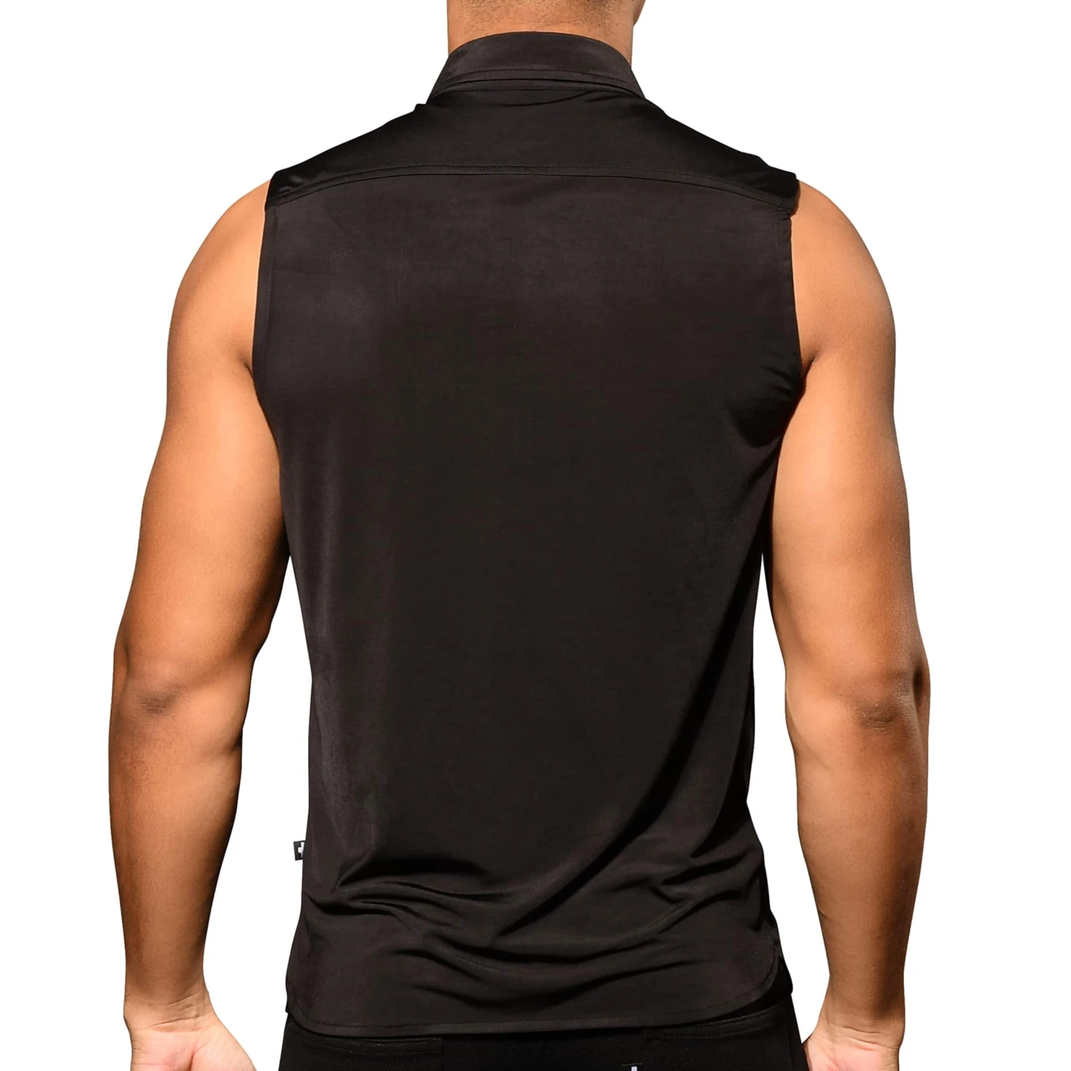 Chemise sans manche en microfibre extensible, soyeuse et légÚre. Coupe cintrée pour valoriser votre corps. Col chemise et patte de boutonnage. Edition limitée.