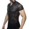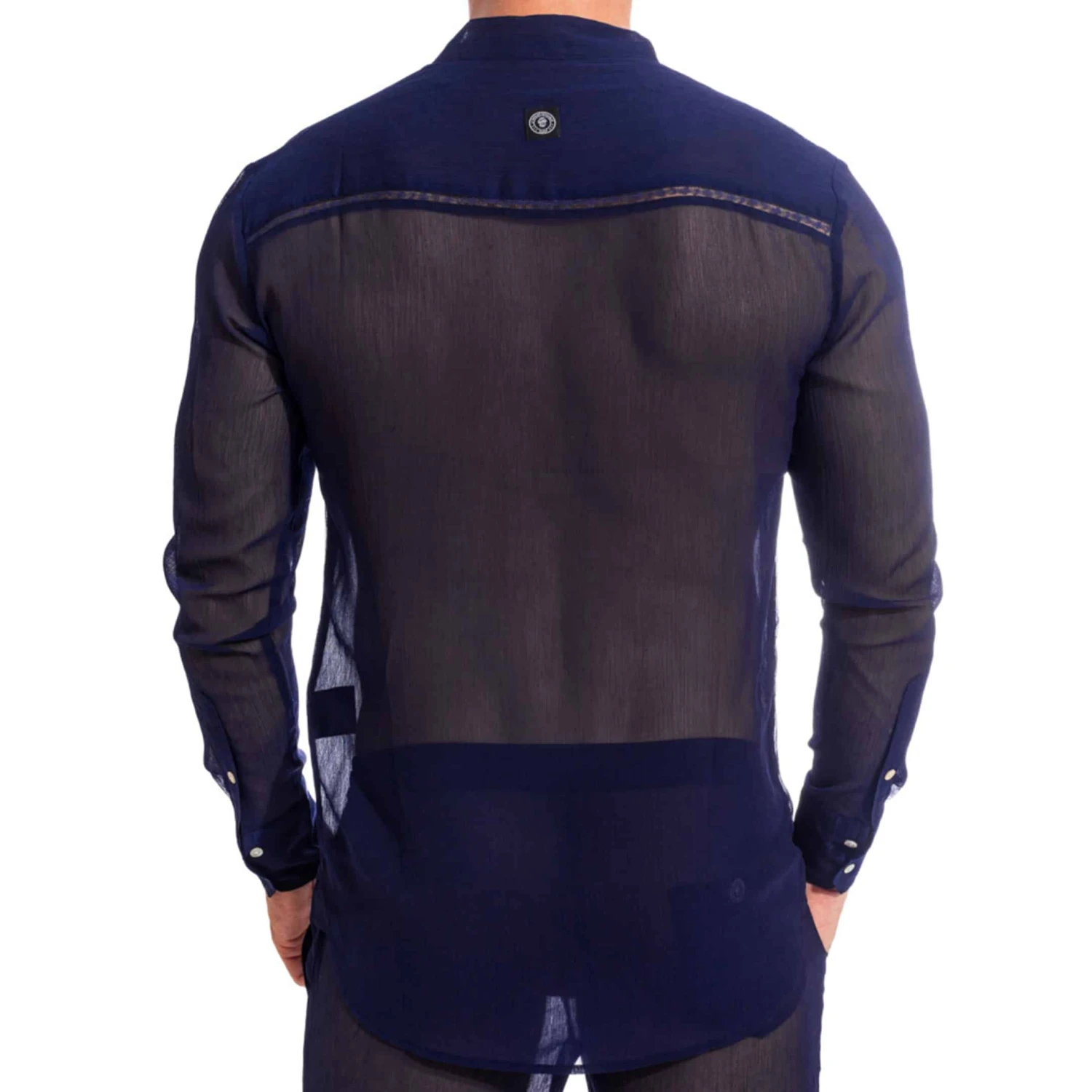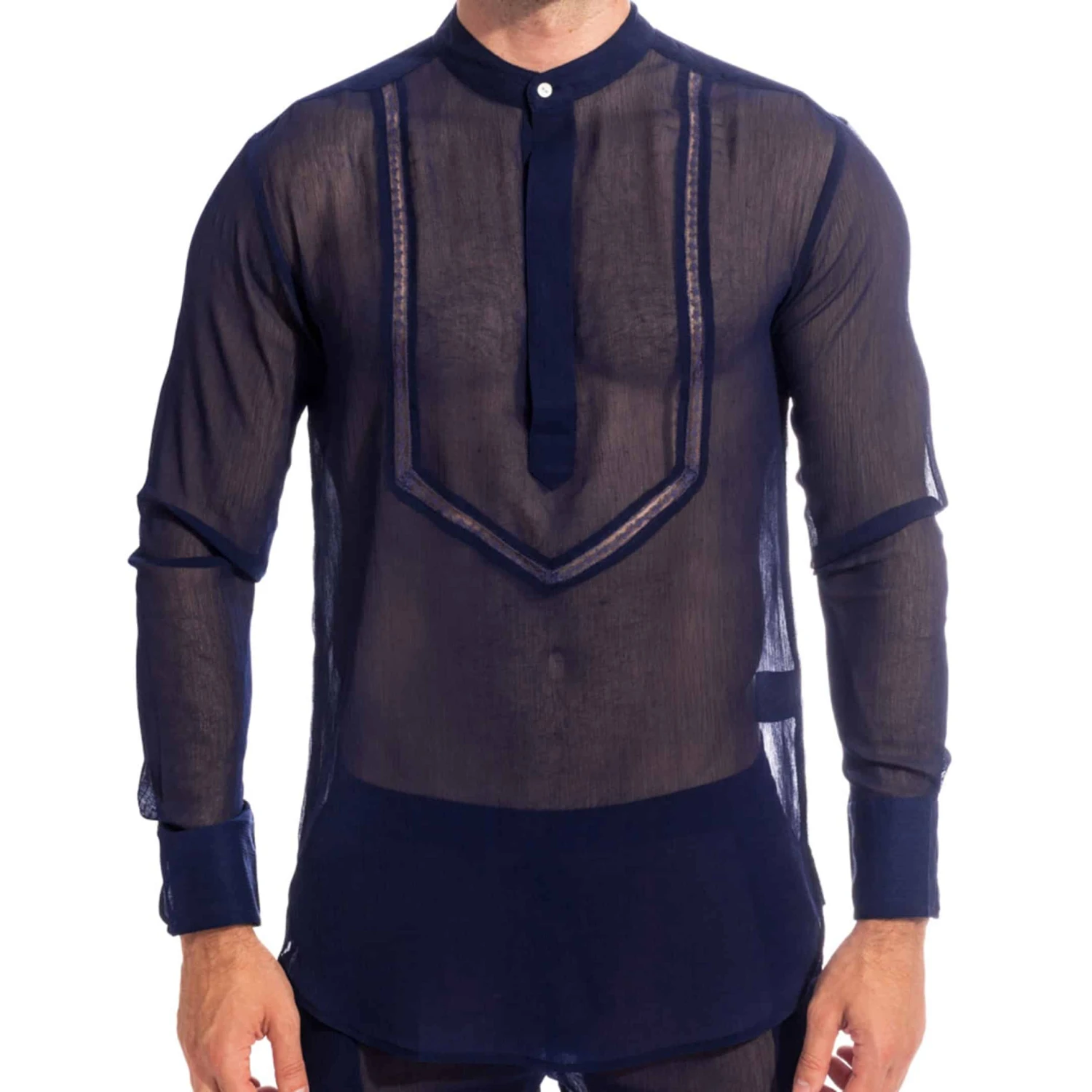 Chemise tunique raffinée en mousseline légÚre et totalement transparente. Détails en dentelle. Col tunisien à 3 boutons. Manches longues avec poignets.