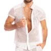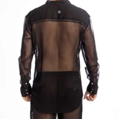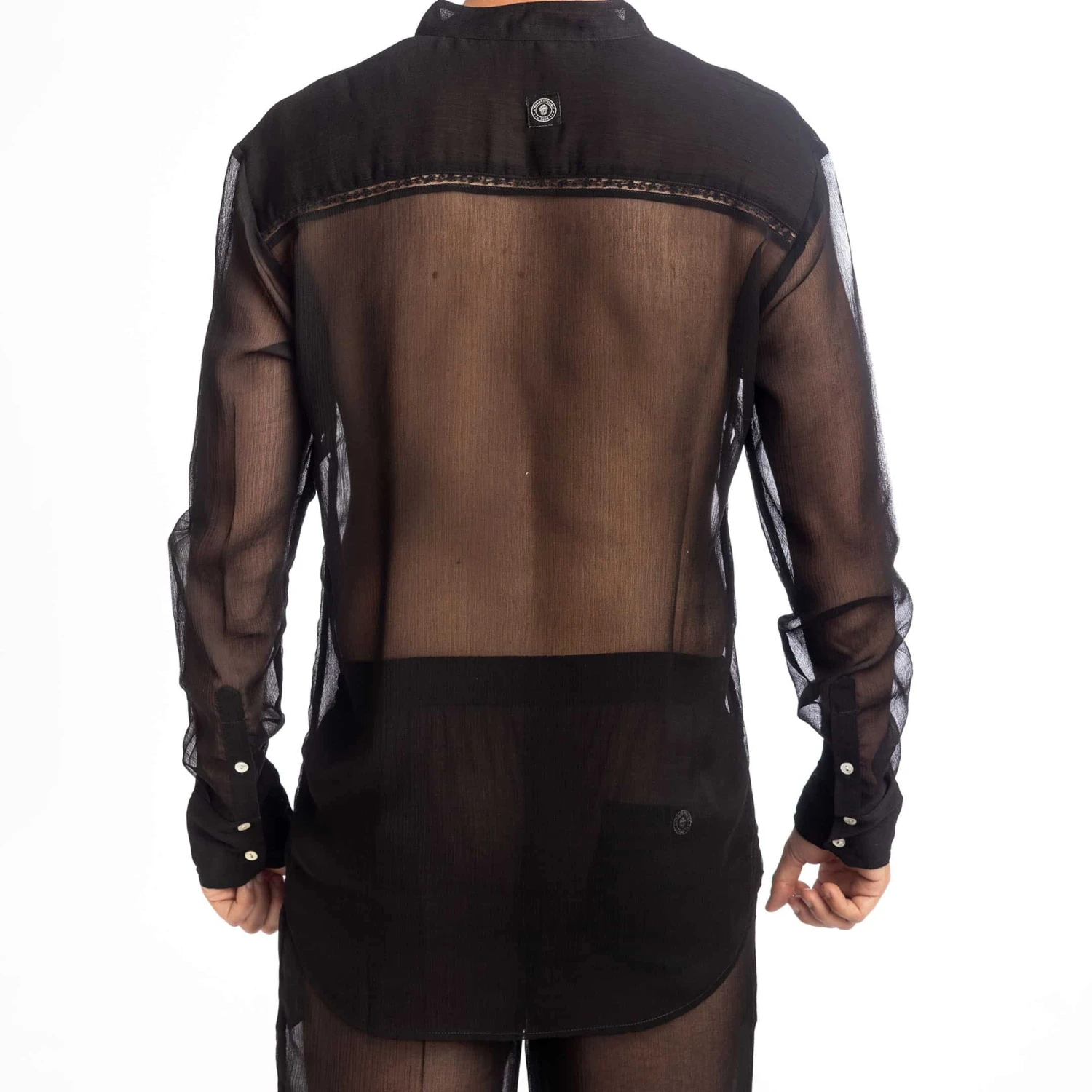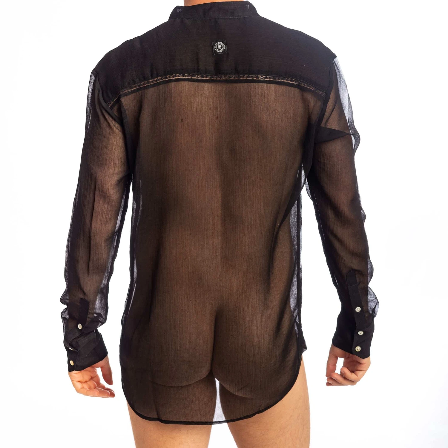 Chemise tunique raffinée en mousseline légÚre et totalement transparente. Détails en dentelle. Col tunisien à 3 boutons. Manches longues avec poignets.