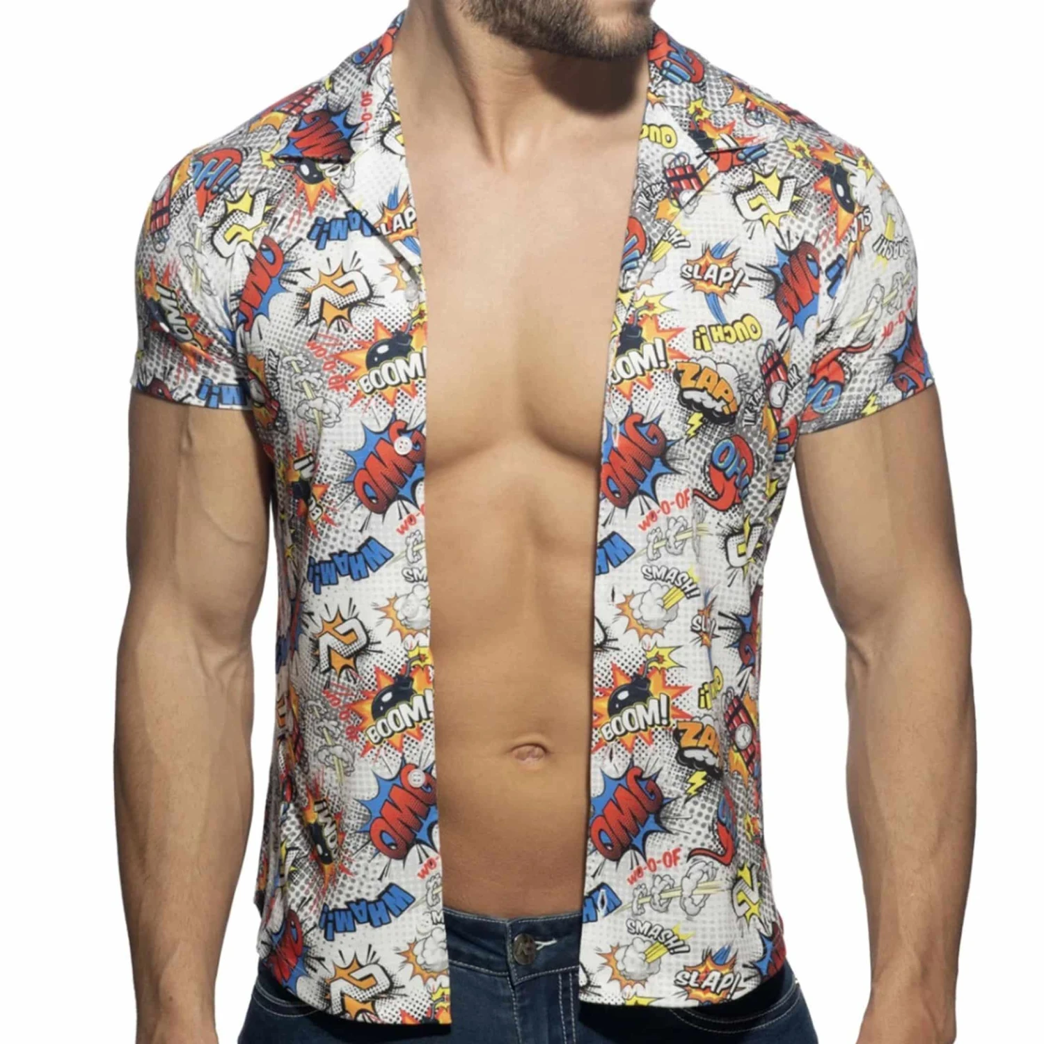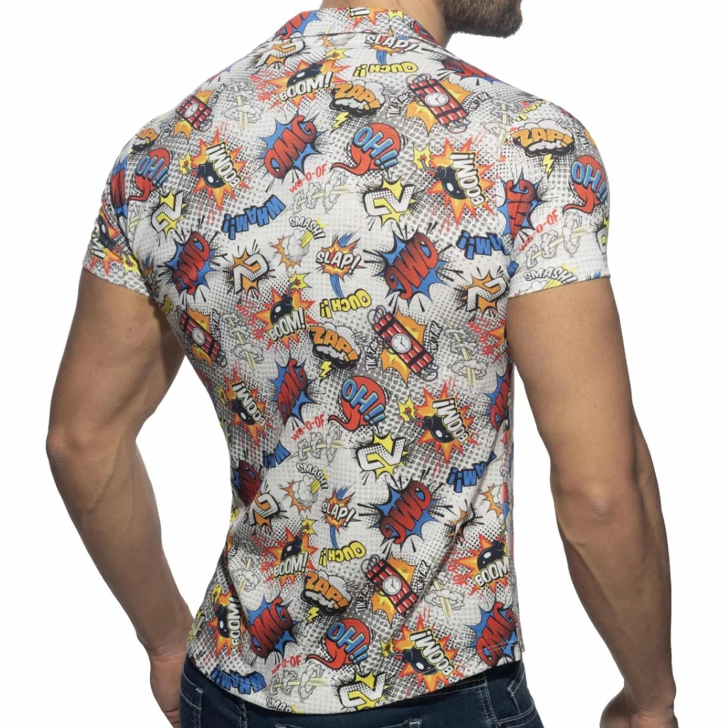 Chemisette trĂšs ajustĂ©e en microfibre imprimĂ©e d’un motif cartoon original et colorĂ©. Col chemise trĂšs ouvert et fermeture 5 boutons.
