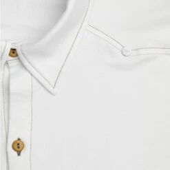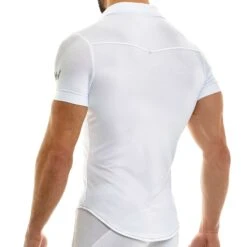 Chemisette cintrée trÚs sexy de couleur unie en mélange de viscose et de microfibre imitant le jeans. Fermeture 6 boutons. 2 poches sur la poitrine. Rivets métalliques signés Modus Vivendi.