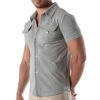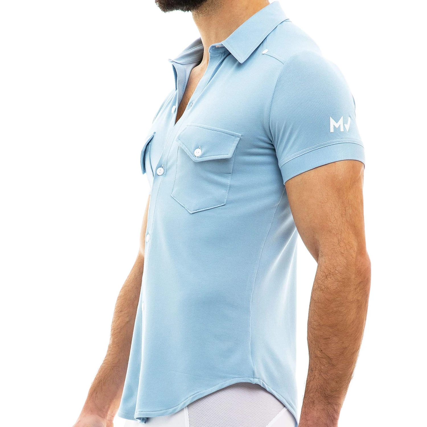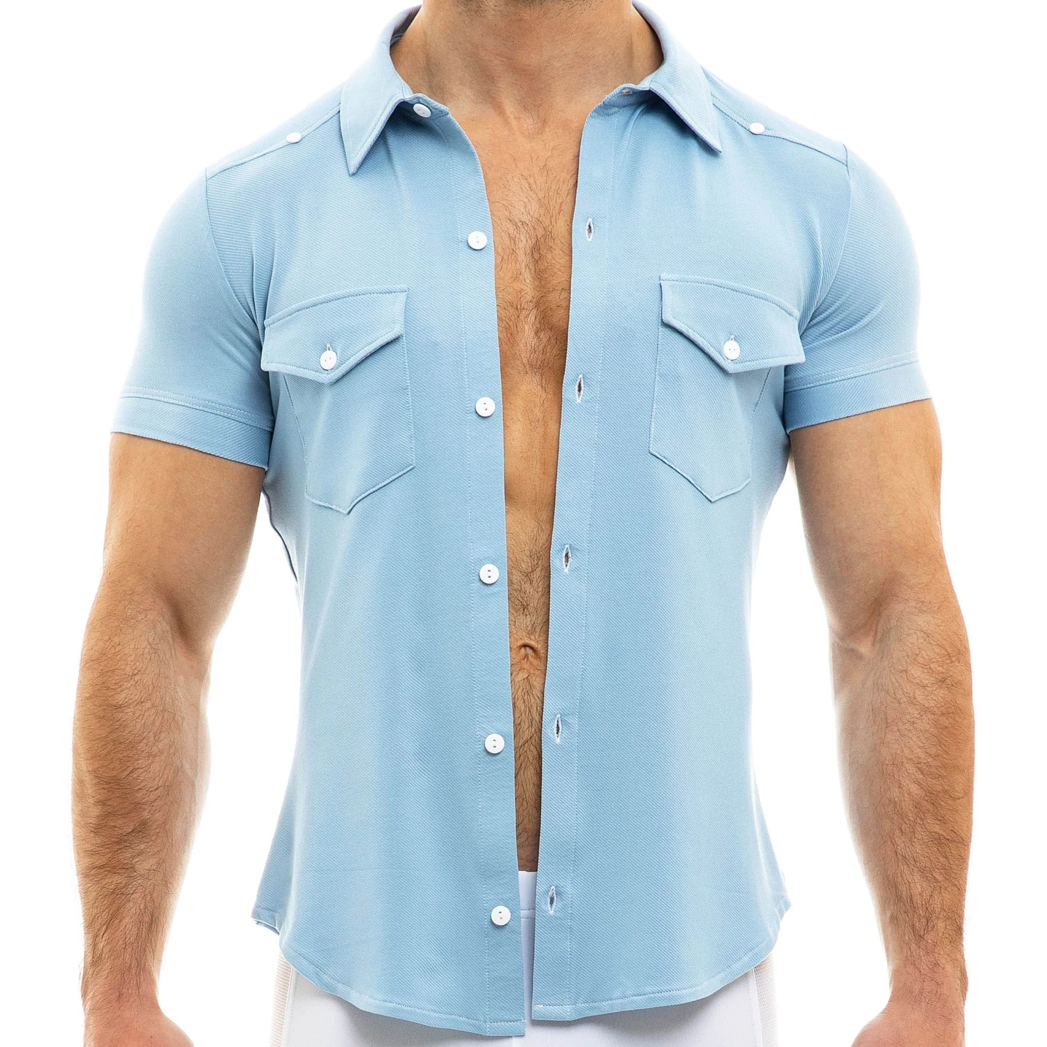 Chemisette cintrée trÚs sexy de couleur unie en mélange de viscose et de microfibre imitant le jeans. Fermeture 6 boutons. 2 poches sur la poitrine. Rivets métalliques signés Modus Vivendi.