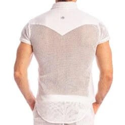 Chemise en rĂ©sille transparente 100% coton. Coupe cintrĂ©e arrondie en bas. Manches courtes. Patte de boutonnage invisible. EmpiĂšcement opaque en haut du dos avec logo L’homme Invisible.