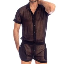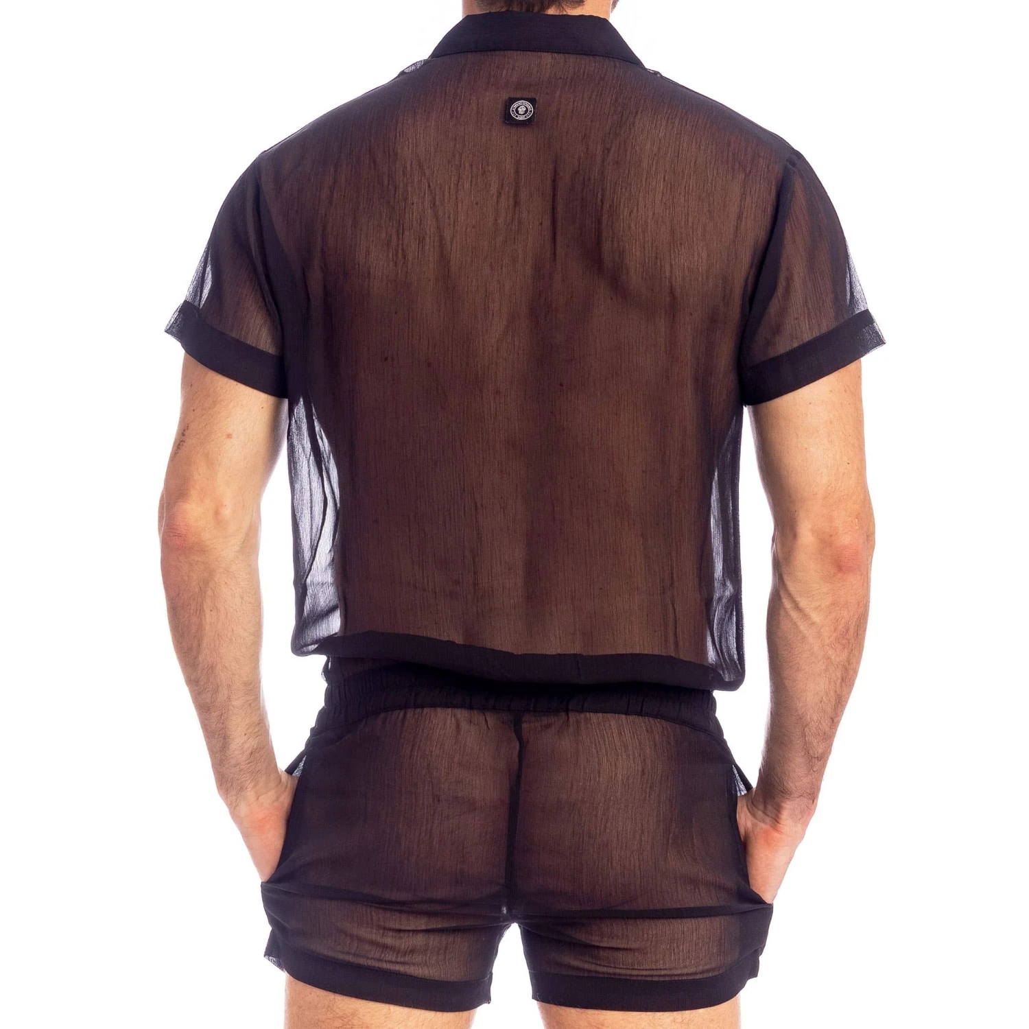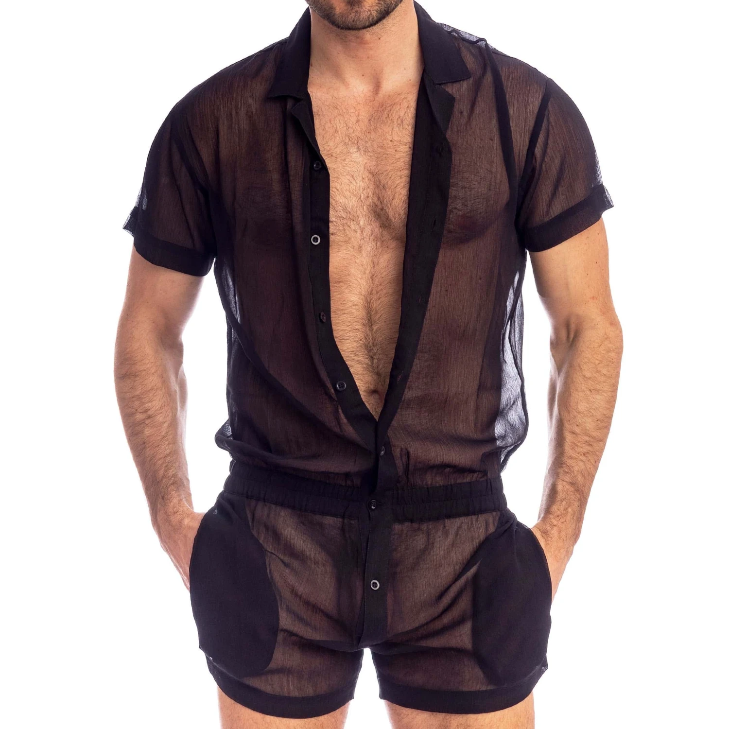 Body raffinĂ© en mousseline lĂ©gĂšre et totalement transparente. Coupe ample, resserrĂ©e Ă la taille. Fermeture Ă boutons Ă l’avant. Col chemise et manches courtes. 2 poches.