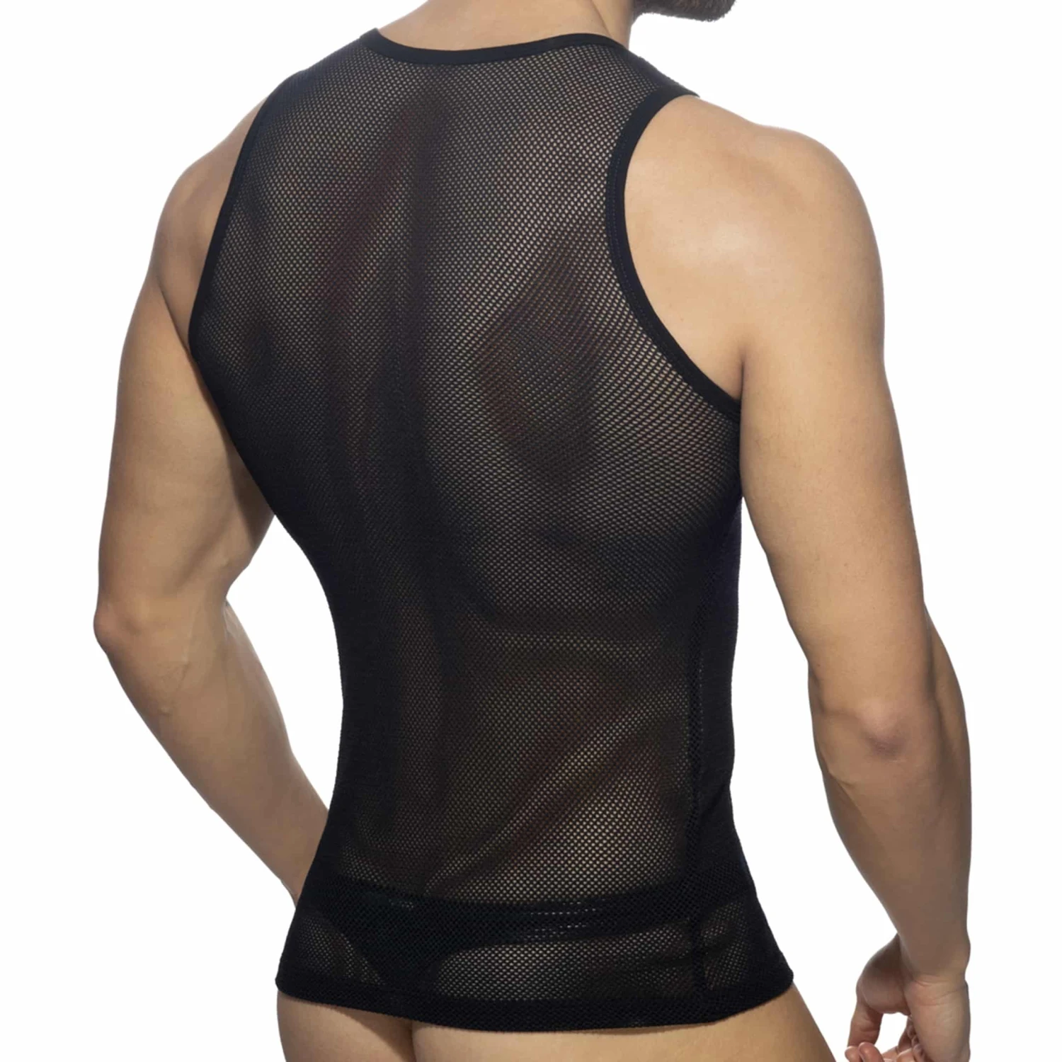 DĂ©bardeur sexy en rĂ©sille transparente, lĂ©gĂšre et respirante. Design original et innovant avec ses empiĂšcements croisĂ©s sur la poitrine dĂ©voilant juste ce qu’il faut de peau. Logo AD Fetish en silicone.