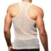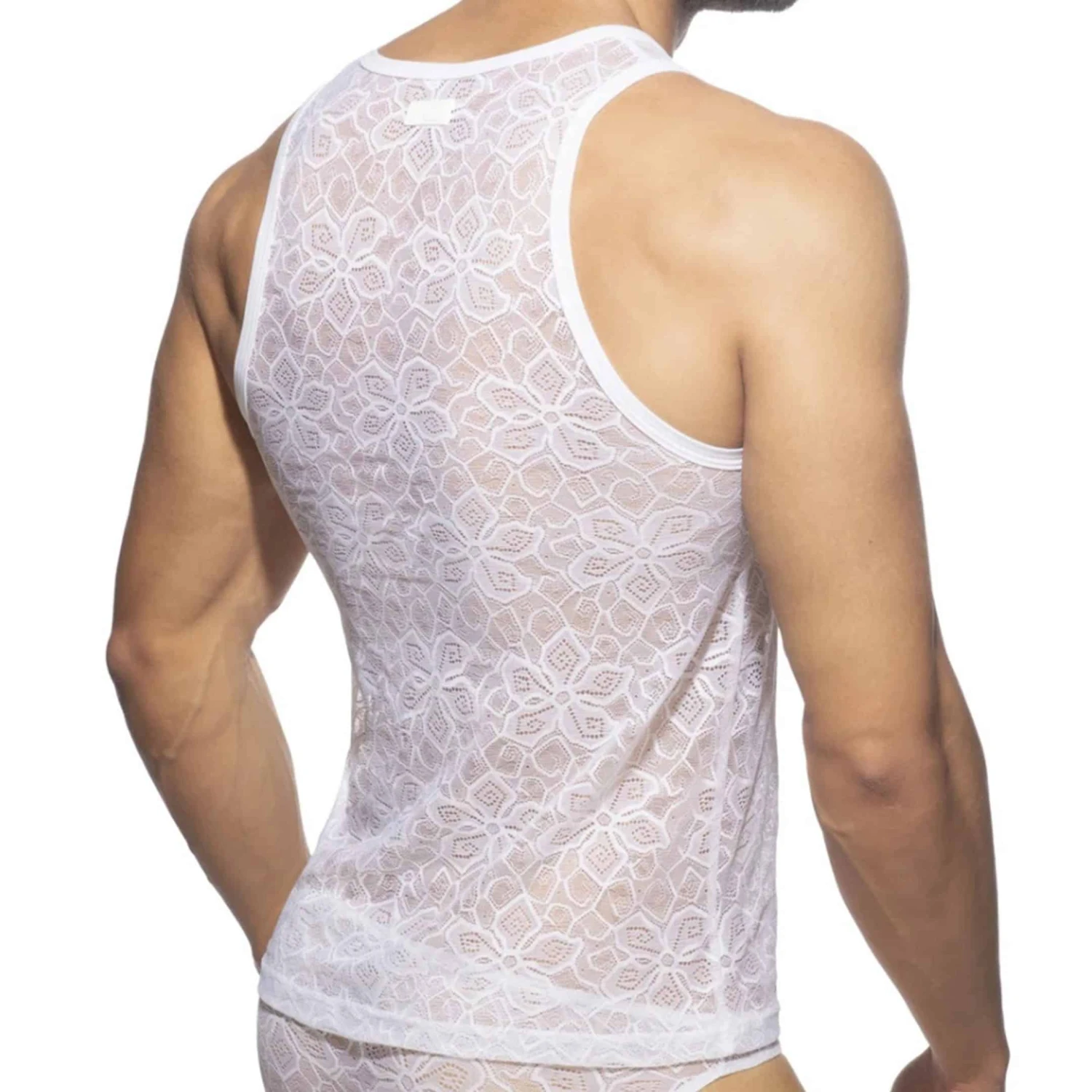 DĂ©bardeur sexy en dentelle dĂ©corĂ©e d’un motif floral. Coupe trĂšs ajustĂ©e. Logo Addicted en silicone en haut du dos.