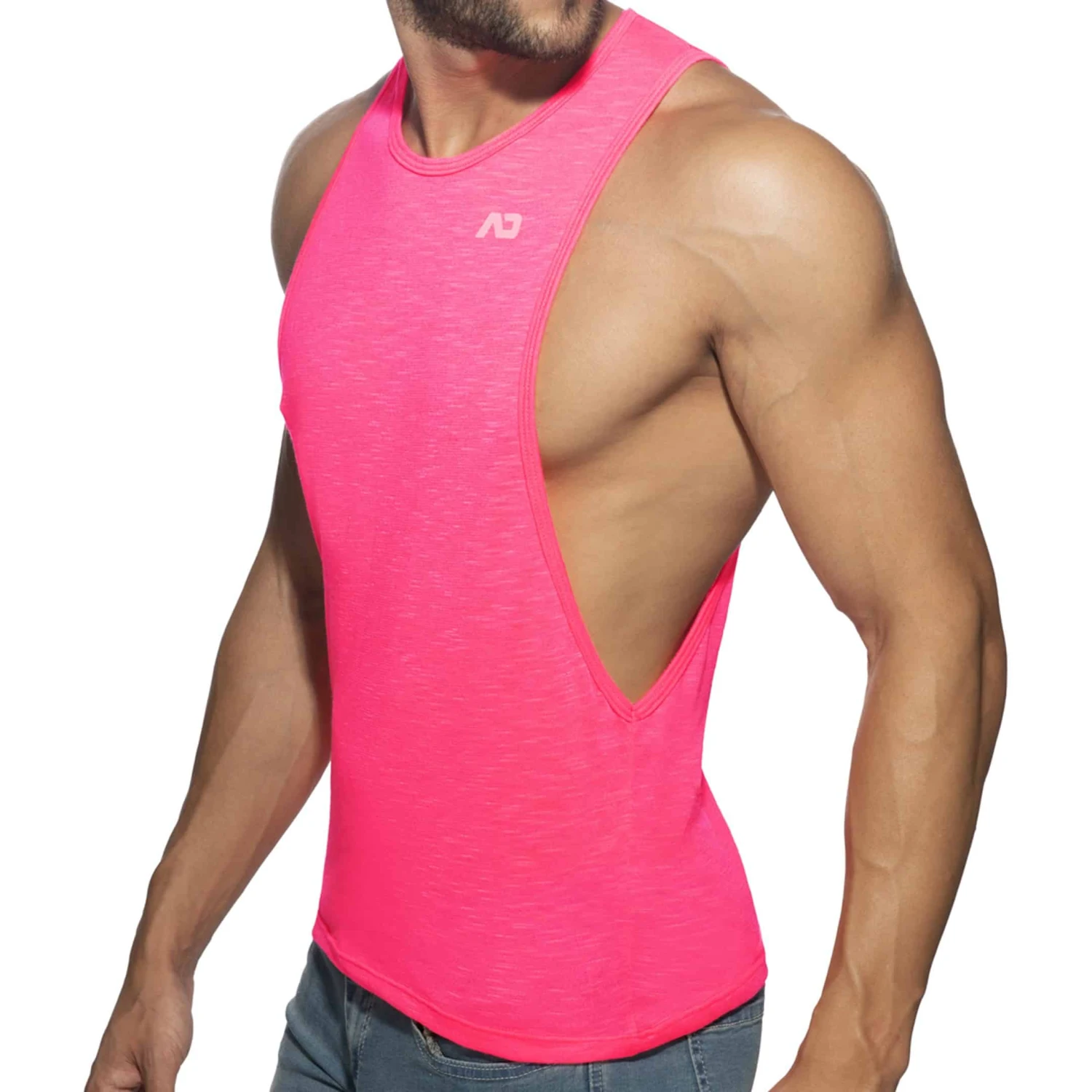 Débardeur en microfibre flammée trÚs fine, légÚre, et semi-transparente. Large ouvertures sous les bras. Imprimé Addicted ton sur ton sur la poitrine et dans le dos.