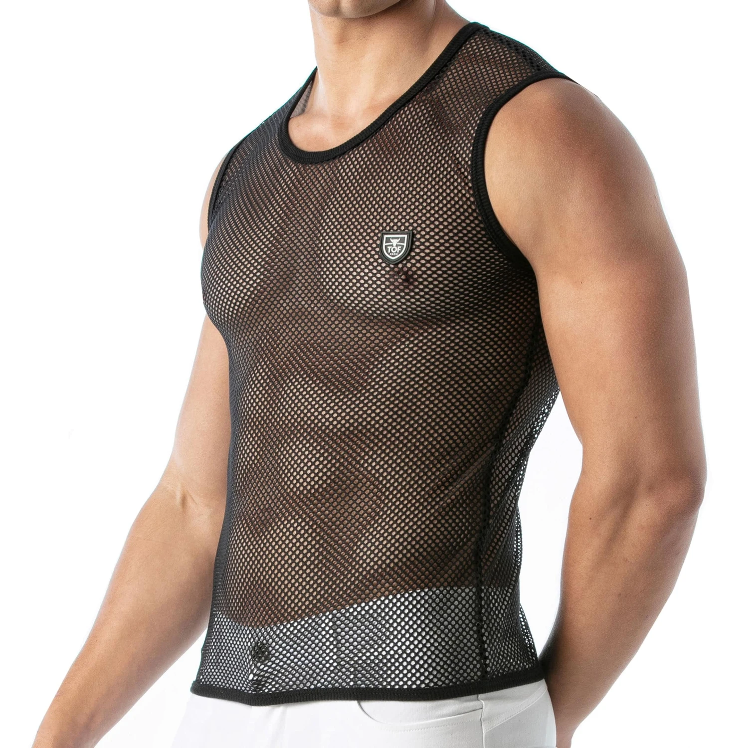 Débardeur ajouré en maille transparente. Coupe ajustée. Logo TOF Paris en silicone sur la poitrine. Fabrication française.