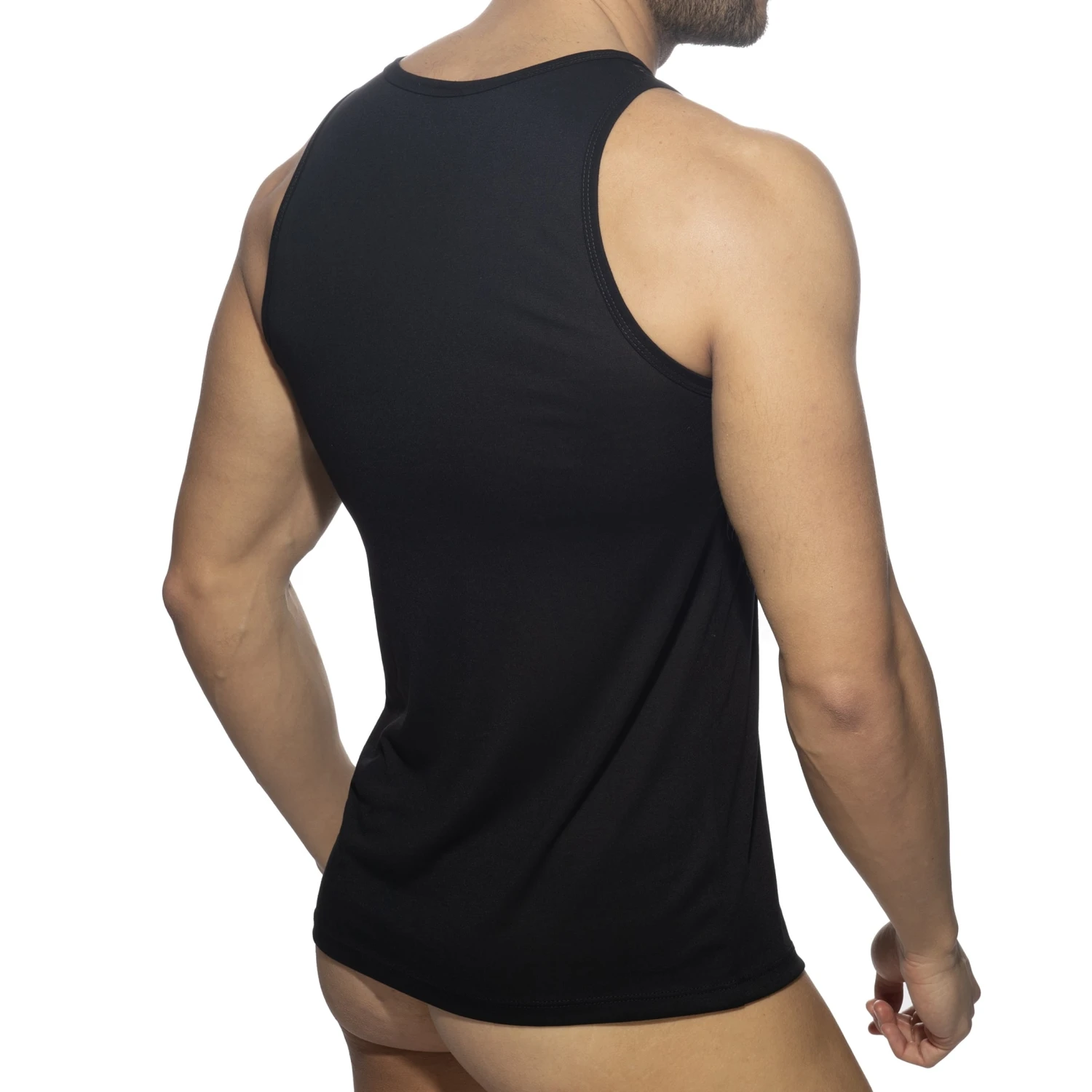 Débardeur sexy en tissu doux et confortable. Haut du torse en résille à maillage large. Double bande horizontale sur la poitrine. Logo AD Fetish en silicone.