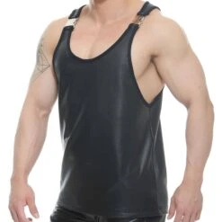DĂ©bardeur en microfibre stretch imitant le cuir. Boucles mĂ©talliques fonctionnelles sur les bretelles. Larges ouvertures sous les bras. Etiquette STUD WEAR IT PROUD Ă l’arriĂšre.