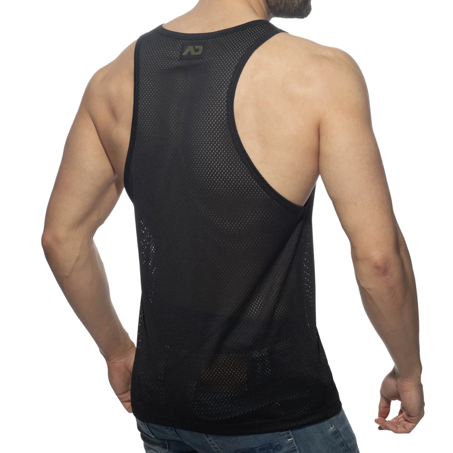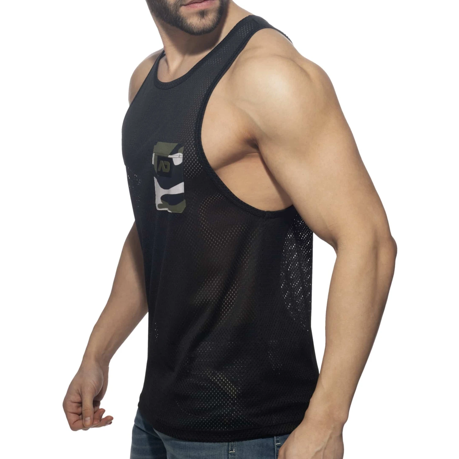 Débardeur en mesh extensible, doux et respirant. Poche factice de couleur contrastée sur la poitrine, avec logo AD en silicone.