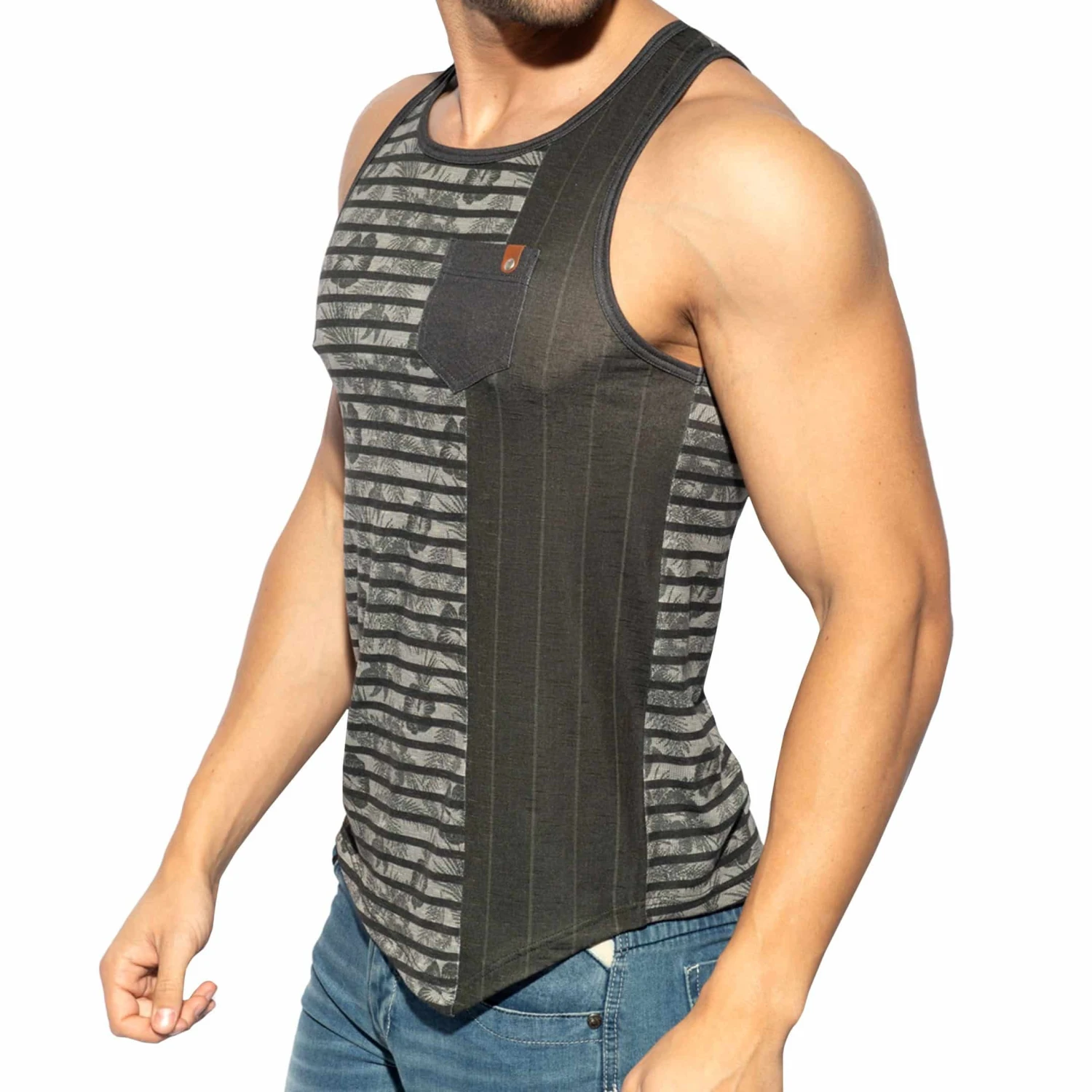 Débardeur très original combinant rayures élégantes et imprimé floral. Coupe asymétrique tombant en V. Poche en jeans sur la poitrine.