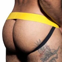Jockstrap de couleur fétichiste ultra sexy et provocant. Design minimaliste intégrant un anneau cock ring en silicone, idéal pour augmenter votre volume frontal. Straps devant et derriÚre. Ceinture élastique signée du logo AD en silicone.