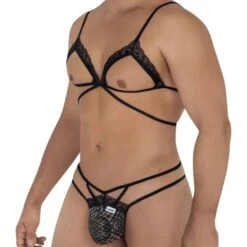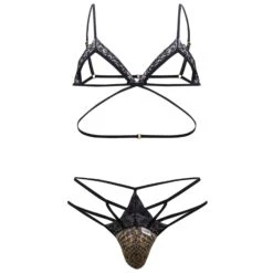 Ensemble sexy et provocant constituĂ© d’un harnais et d’un string. DĂ©tails en dentelle transparente. Harnais façon soutien-gorge avec bretelles rĂ©glables et fermeture par clip mĂ©tallique au dos. String en mesh imprimĂ© d’un motif reptile et dotĂ© de multiples straps Ă©lastiques.