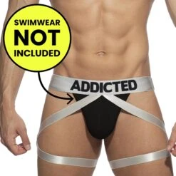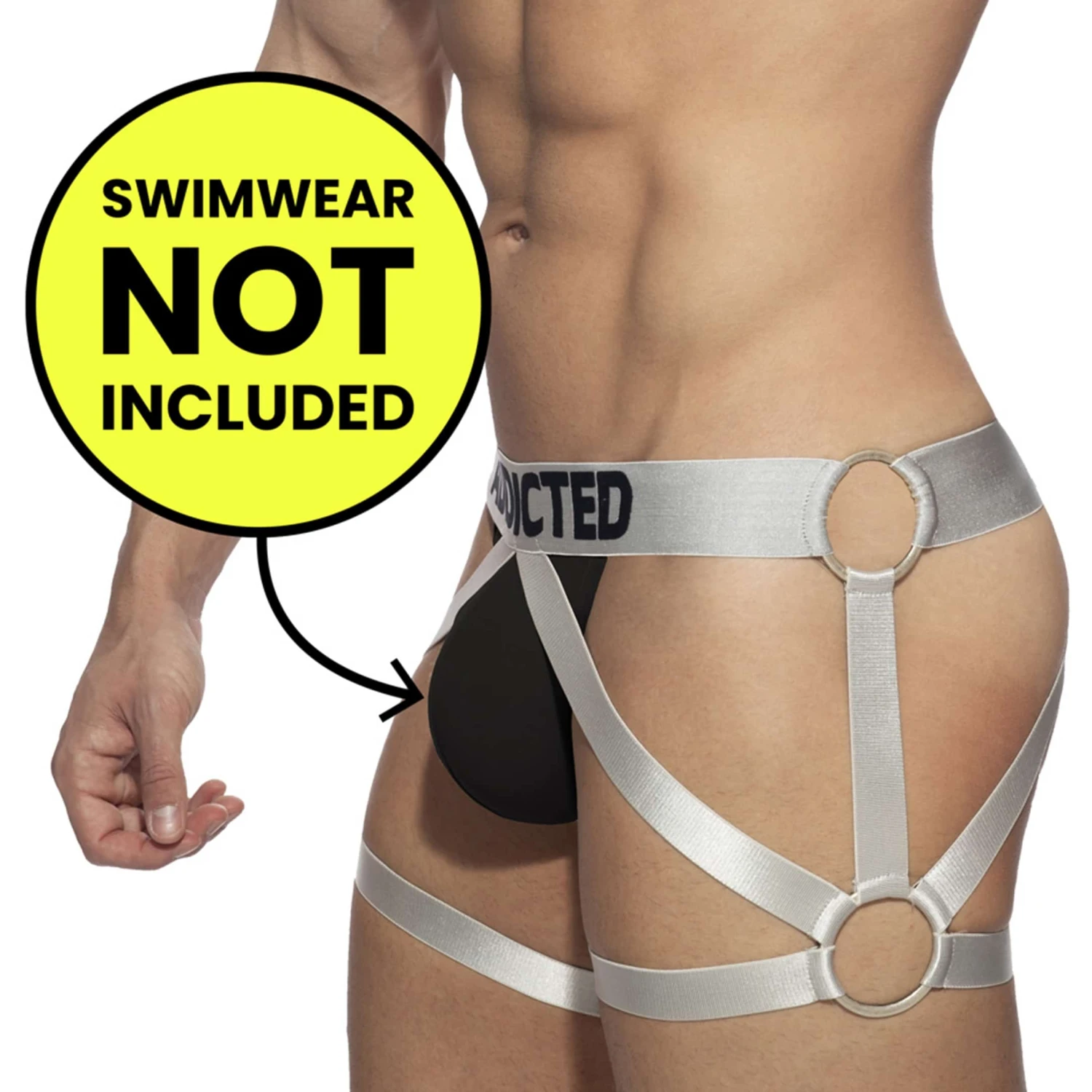 Accessoire masculin trĂšs sexy s’inspirant du porte-jarretelles. ConstituĂ© de bandes Ă©lastiques de couleur mĂ©tallisĂ©e reliĂ©es par des anneaux mĂ©talliques. Ceinture Ă©lastique signĂ©e Addicted. Sous-vĂȘtement vendu sĂ©parĂ©ment.