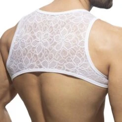 Harnais trĂšs luxueux en dentelle transparente dĂ©corĂ©e d’un motif floral. Logo AD en silicone sur la poitrine.