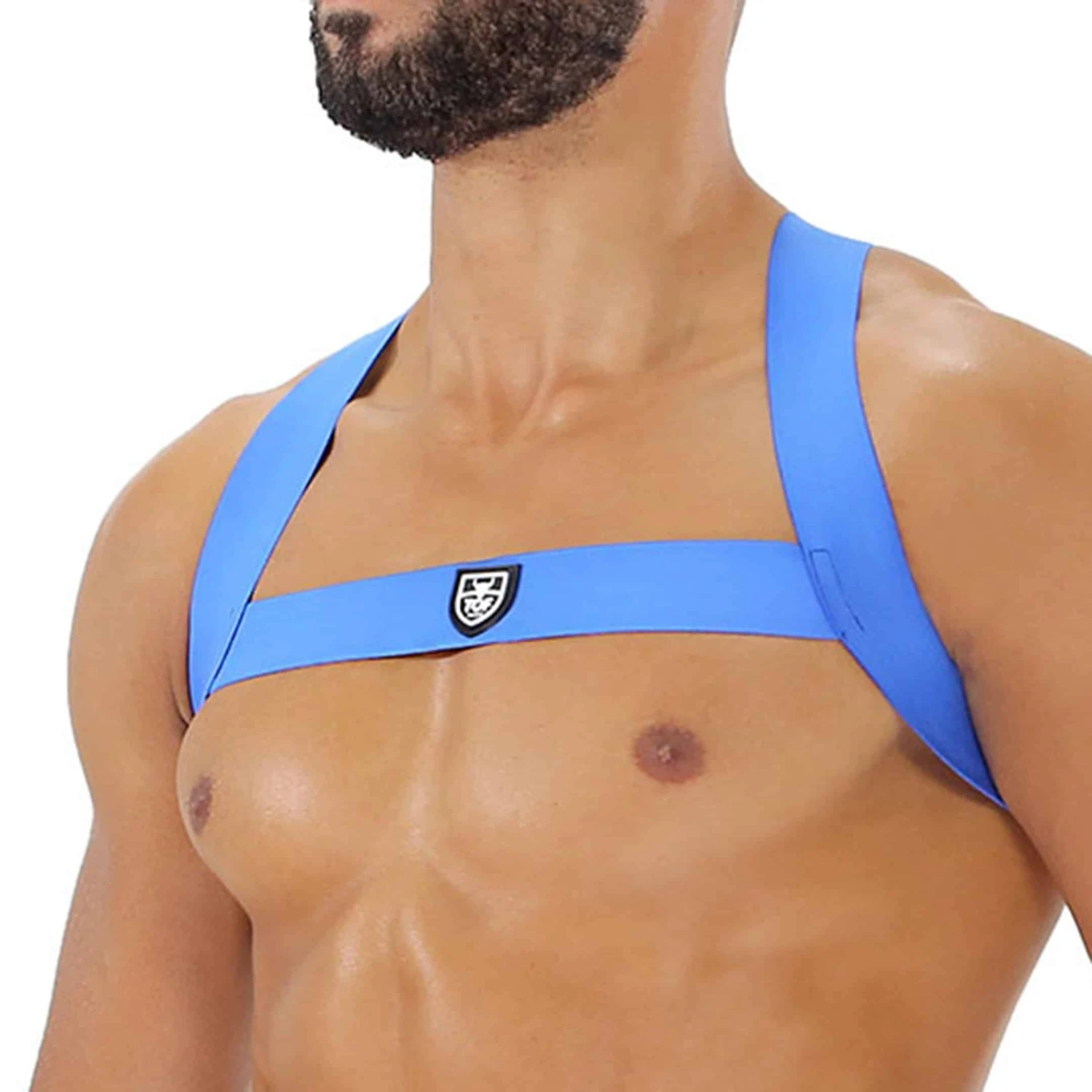 Harnais constituĂ© de bandes elastiques larges de 3,5 cm qui se croisent autour d’un anneau mĂ©tallique dans le dos. Devant, la forme en H met en valeur vos pectoraux. Ecusson TOF Paris. Fabrication française.