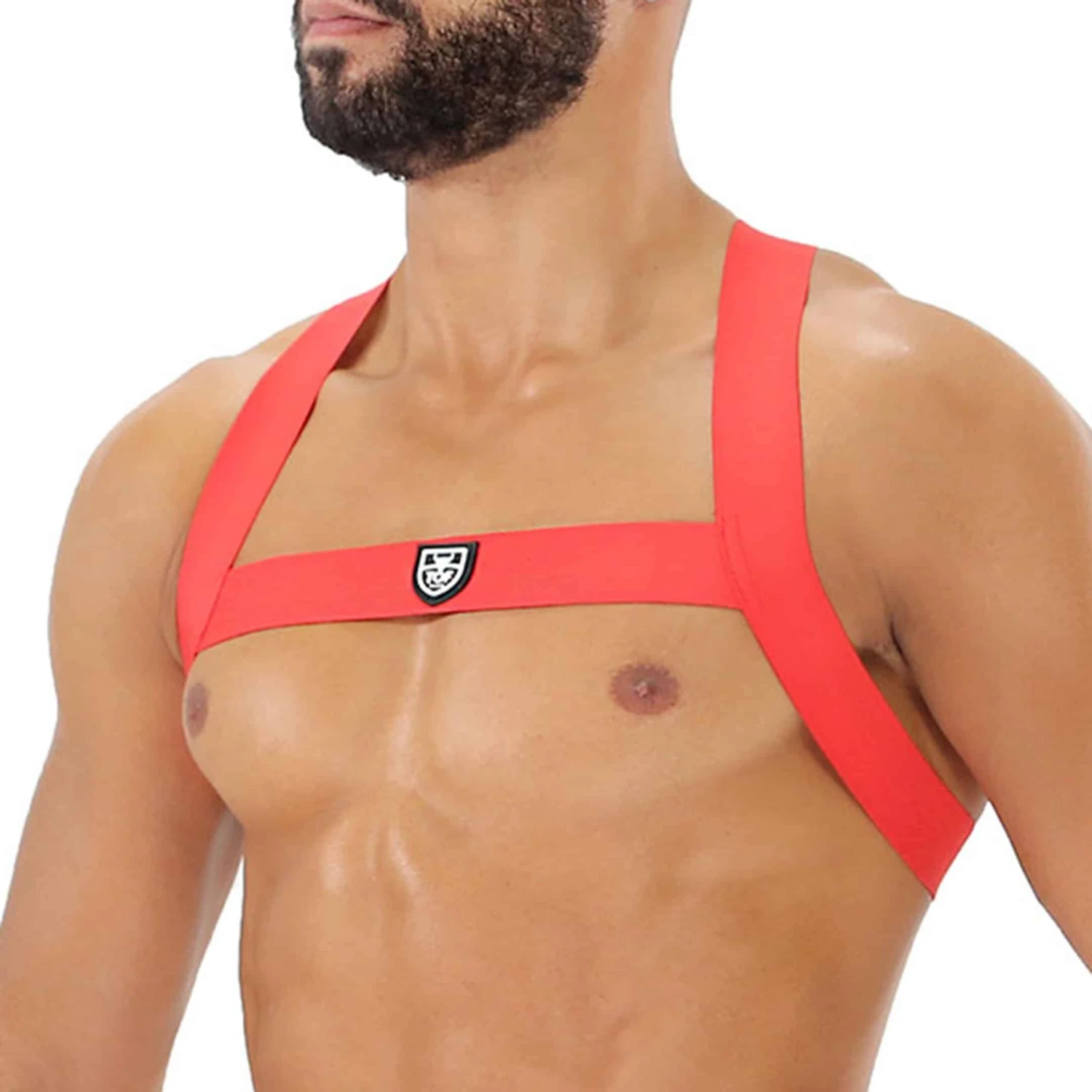 Harnais constituĂ© de bandes elastiques larges de 3,5 cm qui se croisent autour d’un anneau mĂ©tallique dans le dos. Devant, la forme en H met en valeur vos pectoraux. Ecusson TOF Paris. Fabrication française.