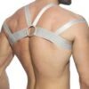 Harnais constitué de bandes élastique en fils métallisés Lurex qui forment un X dans le dos. Devant, la forme en H met en valeur vos pectoraux. 2 anneaux métalliques pour accrocher des bretelles ou autre accessoire. Etiquette TOF en silicone. Fabrication française.