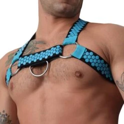 Harnais ultra sexy. Bandes Ă©lastiques recouvertes d’hexagones en silicone brillant. 5 anneaux mĂ©talliques. Logo Breedwell dans le dos.