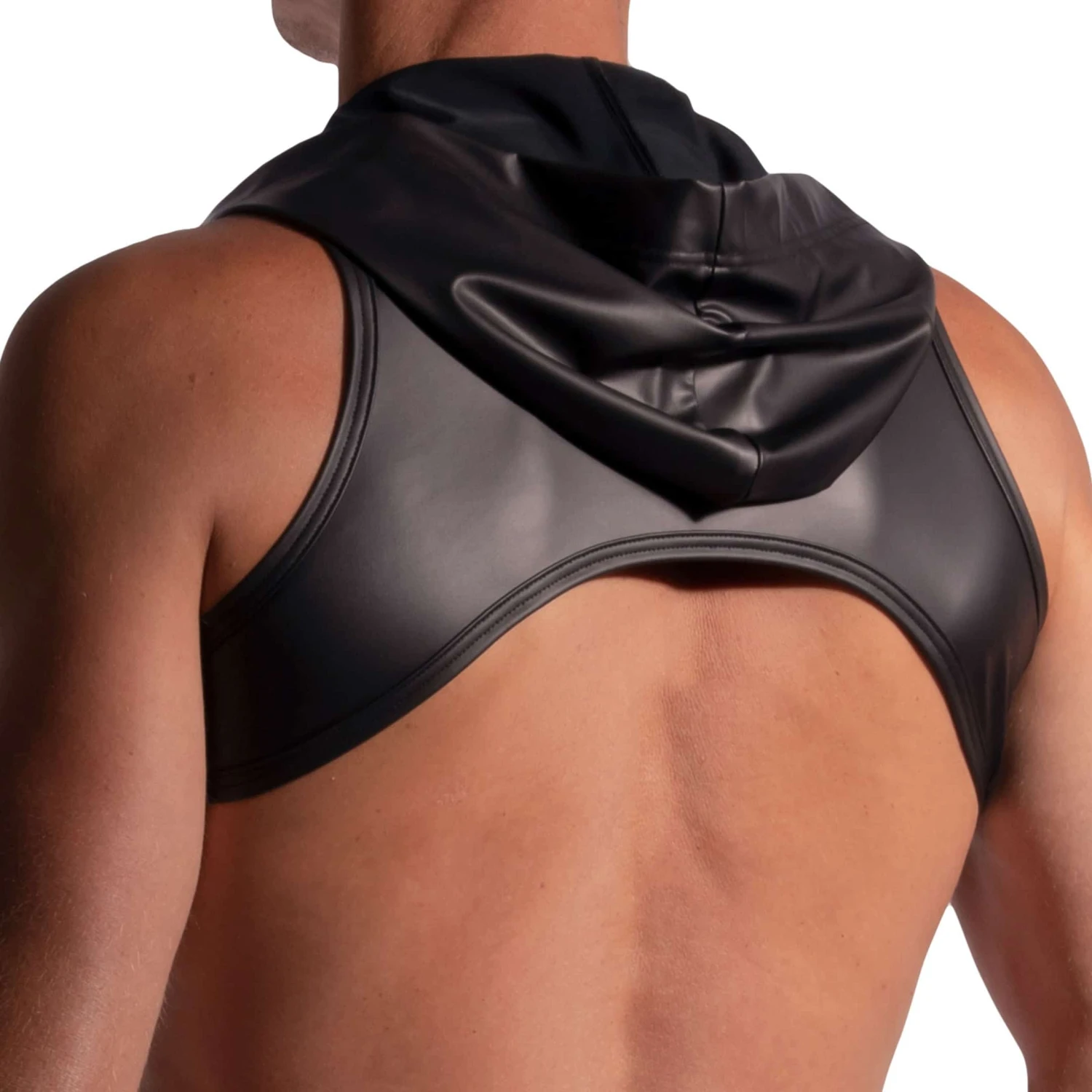 Hybride entre le crop top et harnais, cet accessoire est en simili cuir extensible pour un look trÚs fetish. Capuche. Anneau métalique devant.