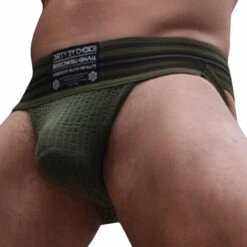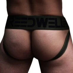 Jockstrap old-school en tissu extensible tricoté. Poche frontale profonde. Ceinture élastique extra-large signée Breedwell.